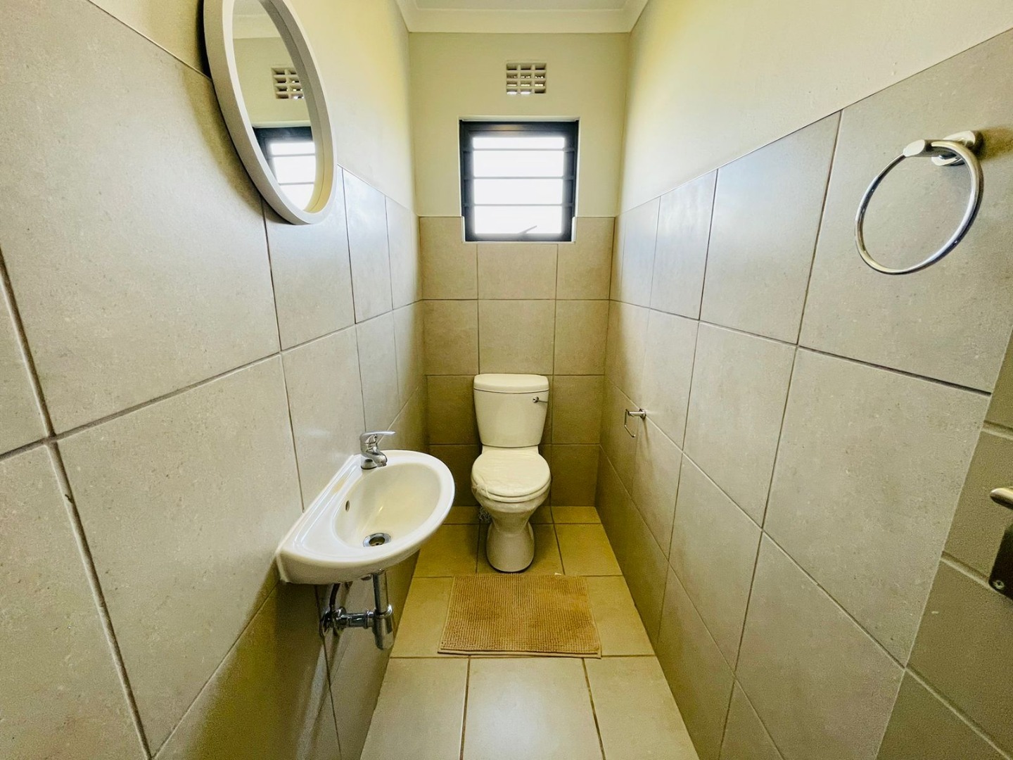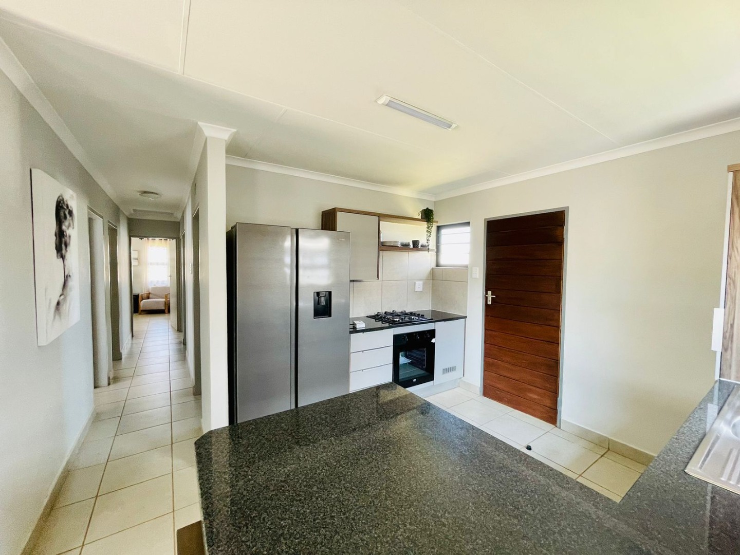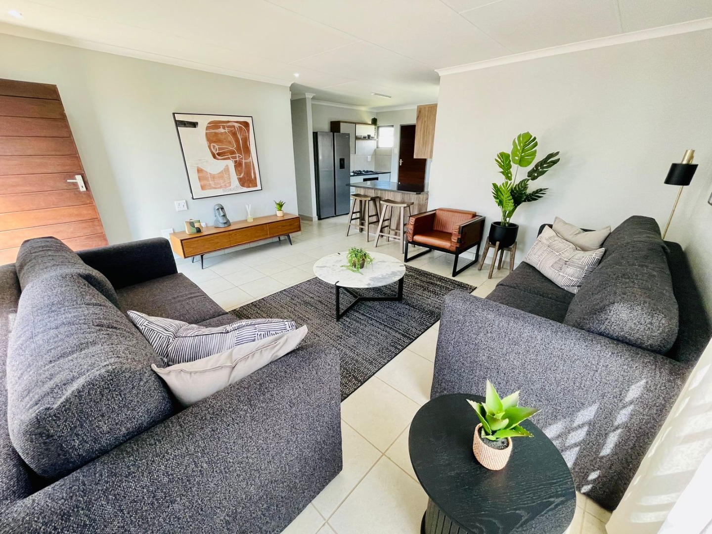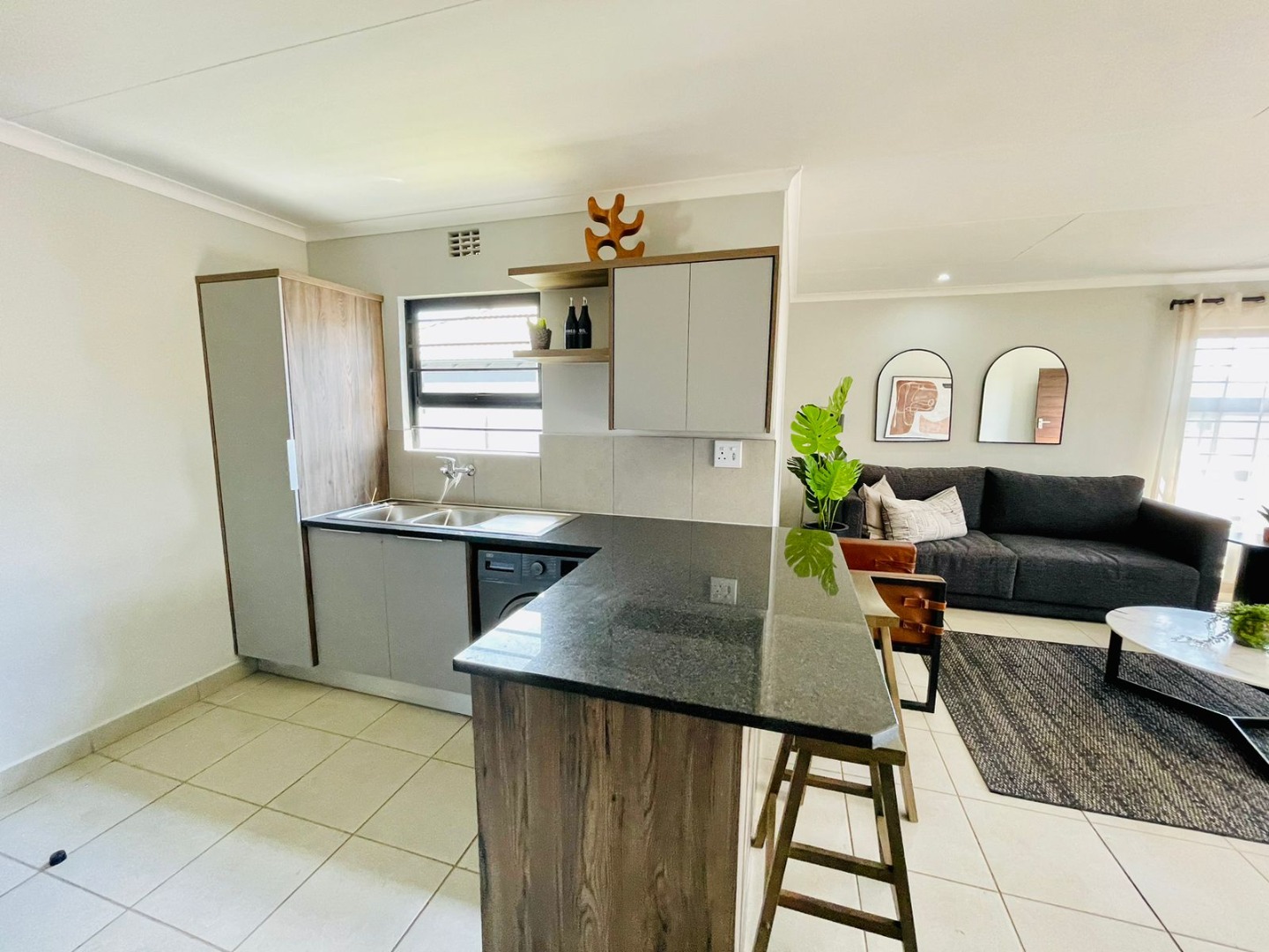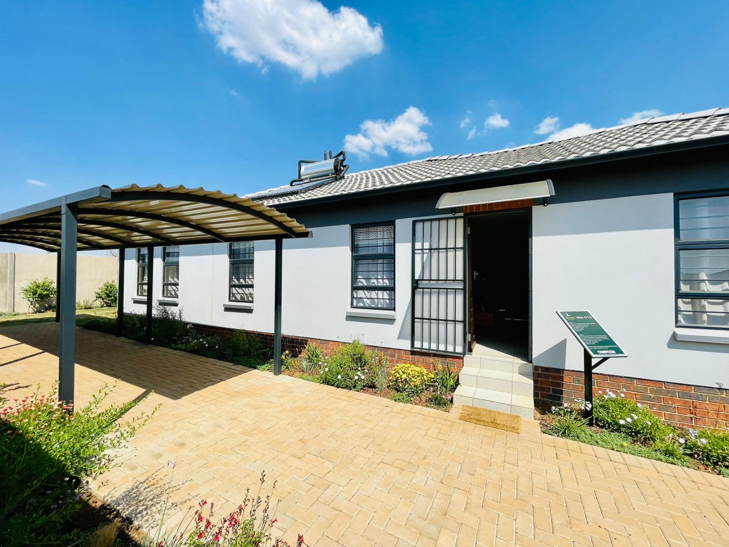 Discover this modern single-story home, perfectly situated within a secure estate in Alberton Central. The property immediately impresses with its distinctive exterior, featuring a contemporary blend of grey, orange, and brick accents. A neatly landscaped front garden and a paved driveway lead to a convenient carport, enhancing its kerb appeal. Practical amenities include a solar water heater, contributing to energy efficiency, while security is assured with window bars and a security gate. Step inside to an inviting open-plan layout, seamlessly connecting the living area with a sleek, modern kitchen. The kitchen is a highlight, boasting dark granite countertops, stylish two-tone cabinetry, and stainless steel appliances including a gas hob, oven, and a large refrigerator. A built-in washing machine adds convenience, and a functional breakfast bar provides casual dining space. Tiled flooring extends throughout the home, offering a clean and low-maintenance aesthetic, ready for your personal touch. This residence offers four comfortable bedrooms, each featuring practical built-in wardrobes and ample natural light from well-placed windows. The tiled flooring continues into the bedrooms, ensuring consistency and ease of care. With 2.5 well-appointed bathrooms, including a guest toilet, the home efficiently caters to family needs. Situated within a secure estate with 24-hour security, residents benefit from enhanced peace of mind. The property is totally walled and further secured with burglar bars and security gates, reinforcing safety. Alberton Central, located in the vibrant city of Alberton, South Africa, offers a suburban lifestyle with convenient access to amenities and transport routes. Key Features: * 4 Bedrooms, 2.5 Bathrooms * Modern Open-Plan Living Area * Sleek Kitchen with Granite Countertops * Built-in Wardrobes in Bedrooms * Paved Driveway and Carport * Energy-Efficient Solar Water Heater * Secure Estate with 24-Hour Security * Burglar Bars and Security Gate * Tiled Flooring Throughout