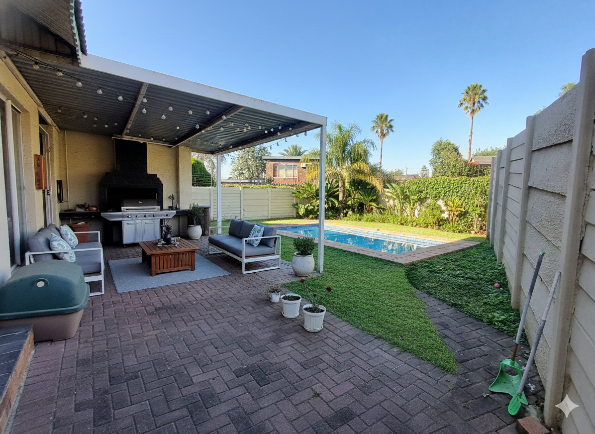 Step outside, and the entertainment continues! The sliding door from the sitting room leads to a covered patio with a built-in braai, making it the perfect spot for hosting weekend get-togethers. The manageable backyard provides just enough space to enjoy without requiring constant maintenance. Under the patio, you'll find a convenient laundry and storage area, as well as an outside guest toilet.
