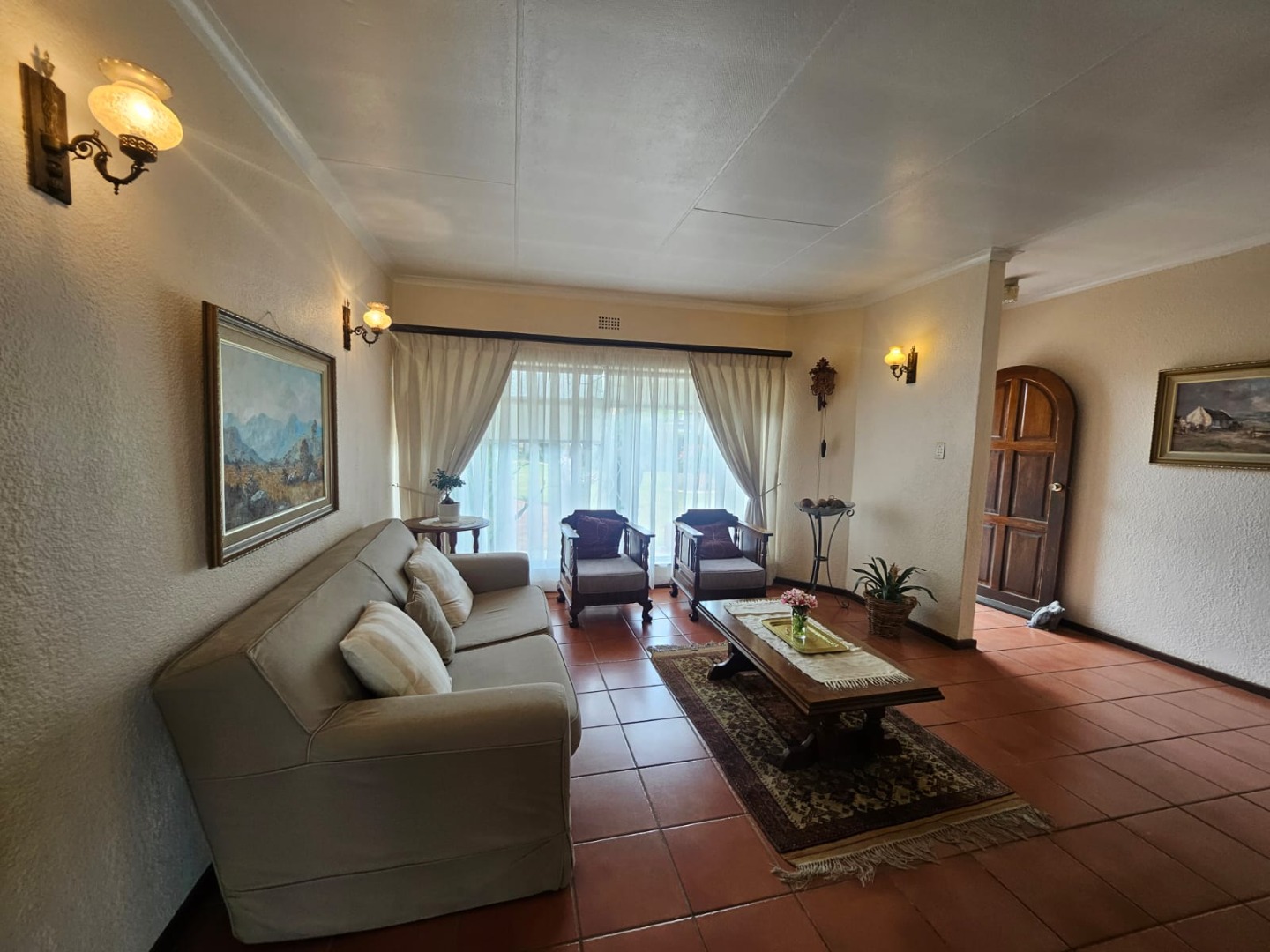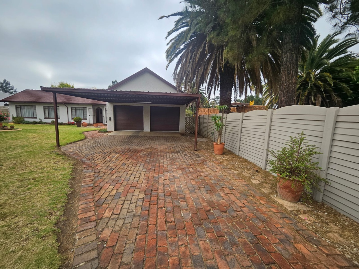 The exterior boasts a spacious covered patio perfect for al fresco dining room and outdoor relaxation overlooking a meticulously maintained garden with mature trees. The property further benefits from paving, a driveway, two garages and an additional parking bay. Pets are permitted, enhancing the family friendly appeal. Security is comprehensively addressed with an alarm system, access gate, CCTV surveillance, a fully walled perimeter, burglar bars and security gates. Modern conveniences include fiber connectivity, water tanks and wheelchair friendly access.