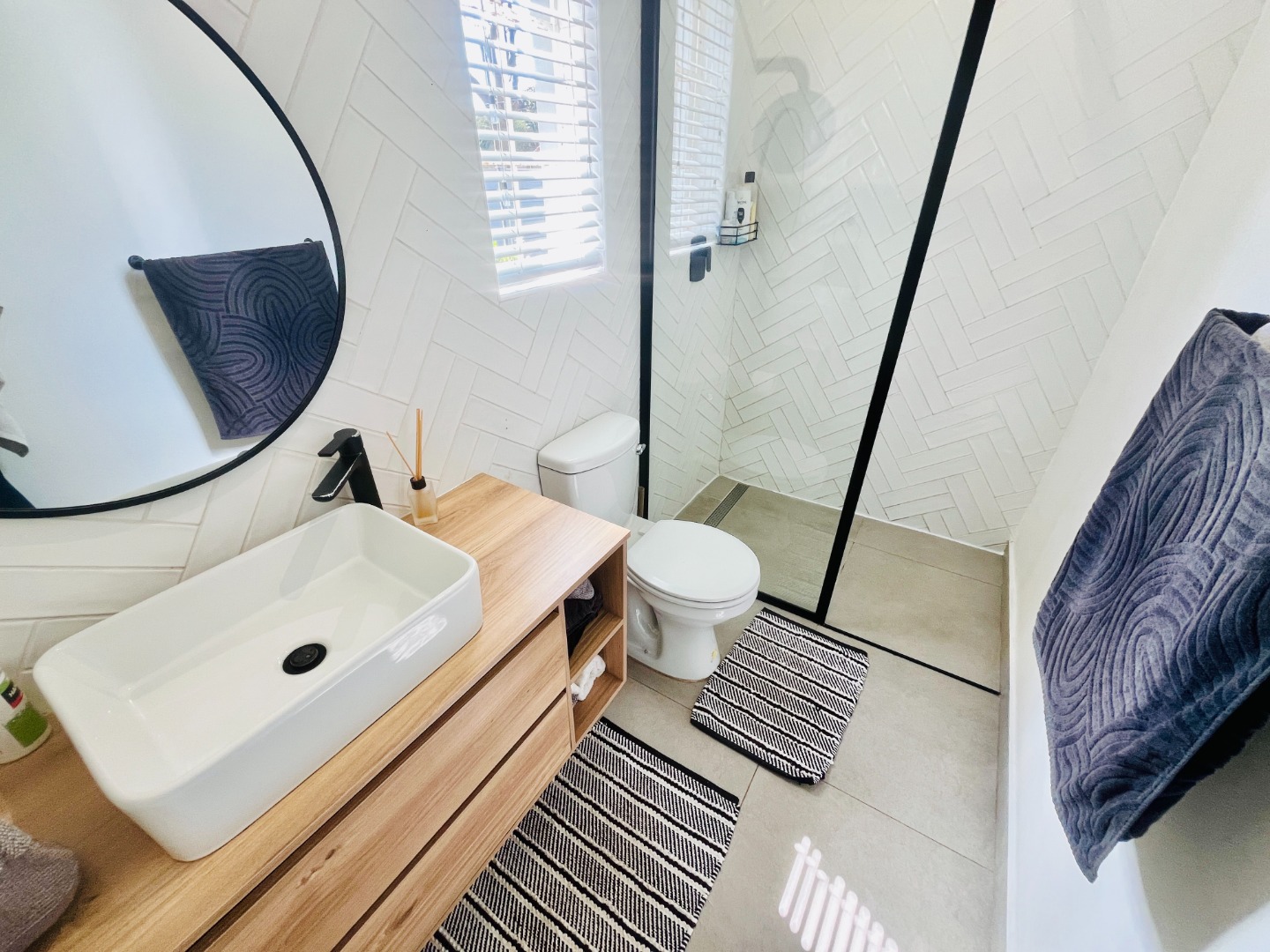 The interior boasts a bright, modern open-plan layout seamlessly connecting the dining and lounge areas. The contemporary kitchen is a highlight featuring sleek white cabinetry, stylish black hardware, light countertops and eye-catching herringbone tiled flooring. Equipped with a gas hob and integrated oven it offers both functionality and aesthetic appeal. Living spaces are enhanced by modern wood-look flooring, air conditioning, and a cozy fireplace. This family home offers three comfortable bedrooms and two well-appointed bathrooms including a private on-suite to the main bedroom.