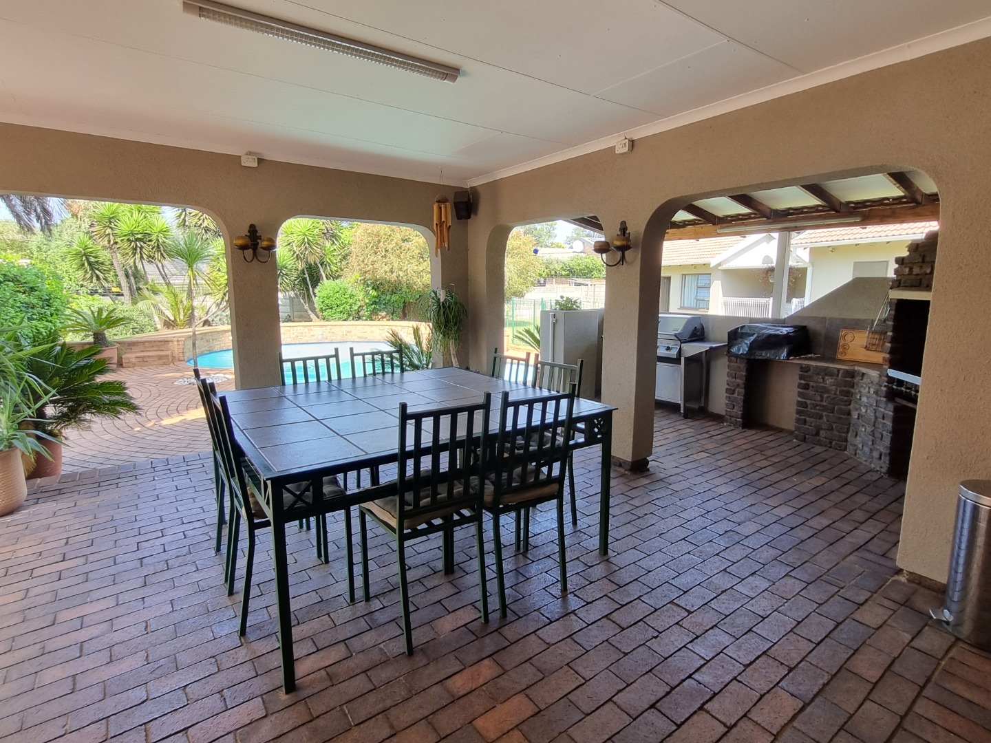 -Covered entertainment patio with built-in braai overlooking pool & garden
