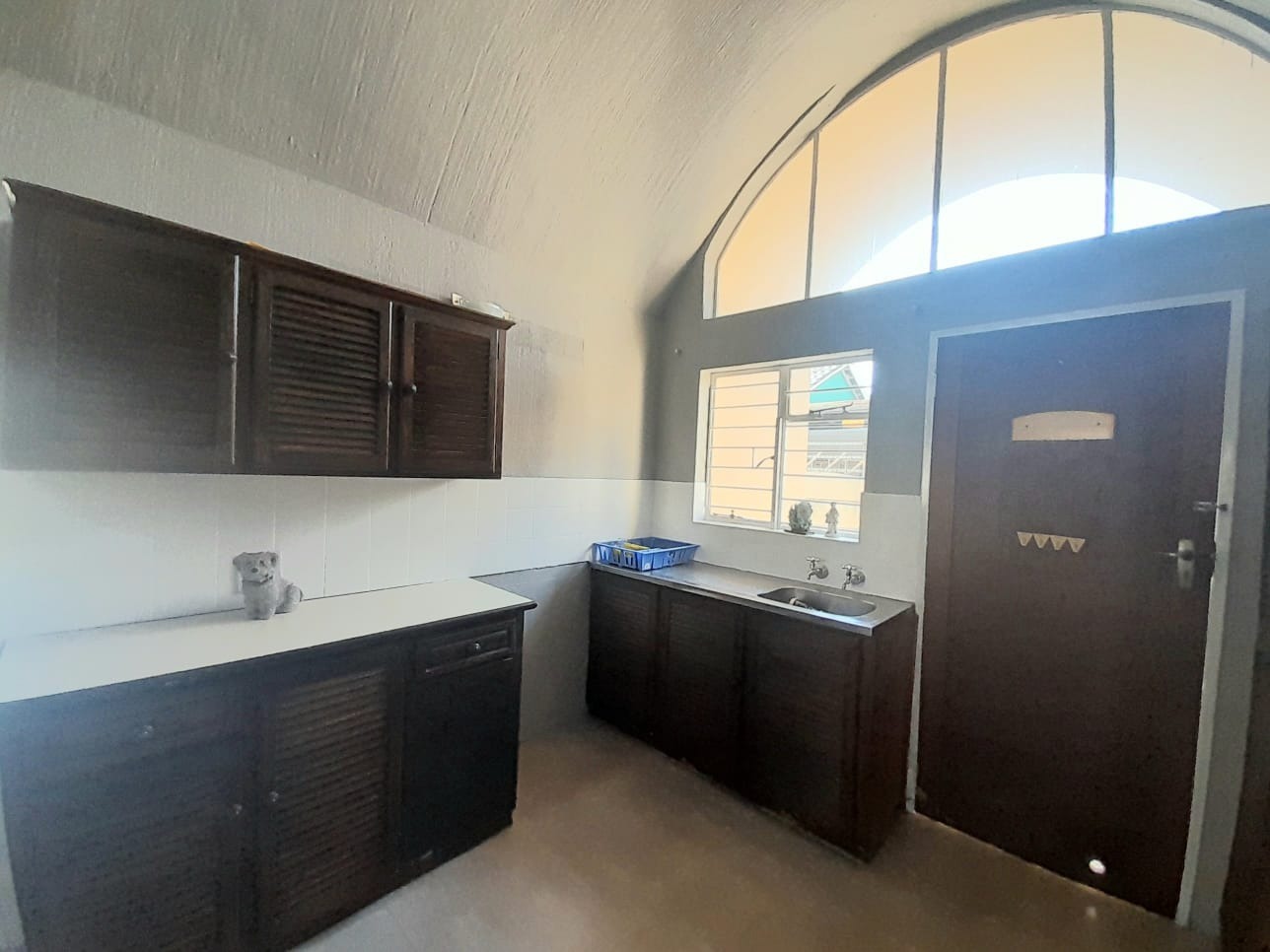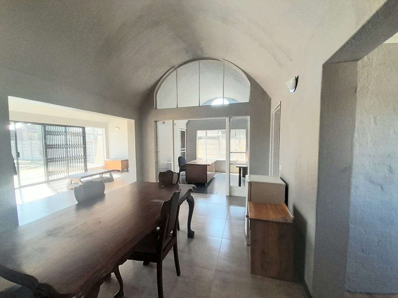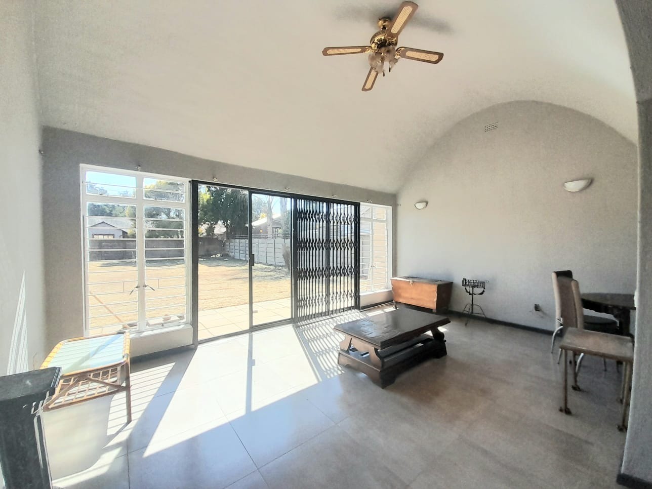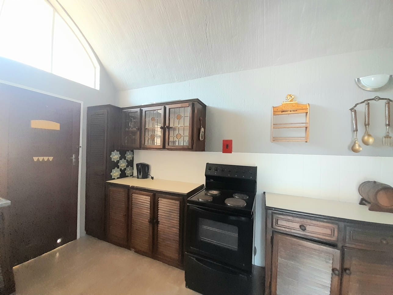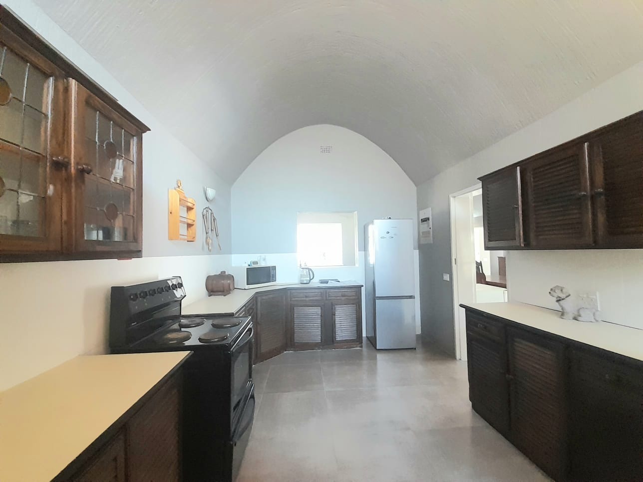 Step inside to find an interior distinguished by unique vaulted and arched ceilings creating a sense of spaciousness and light. The open-plan lounge with durable tiled flooring provides a versatile space for relaxation. Large sliding glass doors secured by robust security gates open to the exterior. The main kitchen equipped with dark wood cabinetry ample storage and a full-sized electric stove offers a functional space with vintage charm, complemented by a secondary utility kitchen.