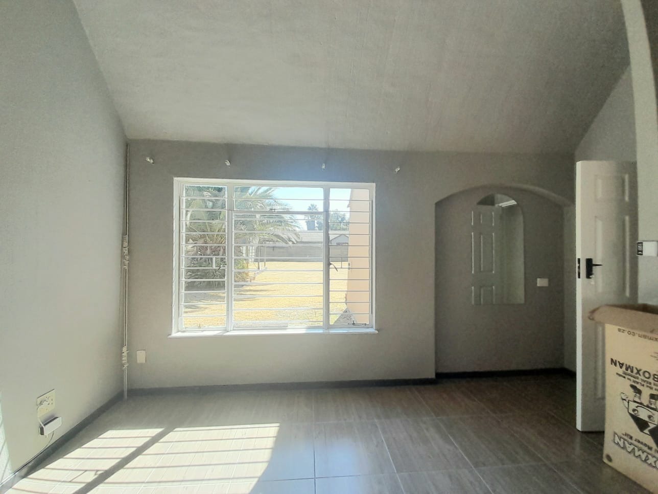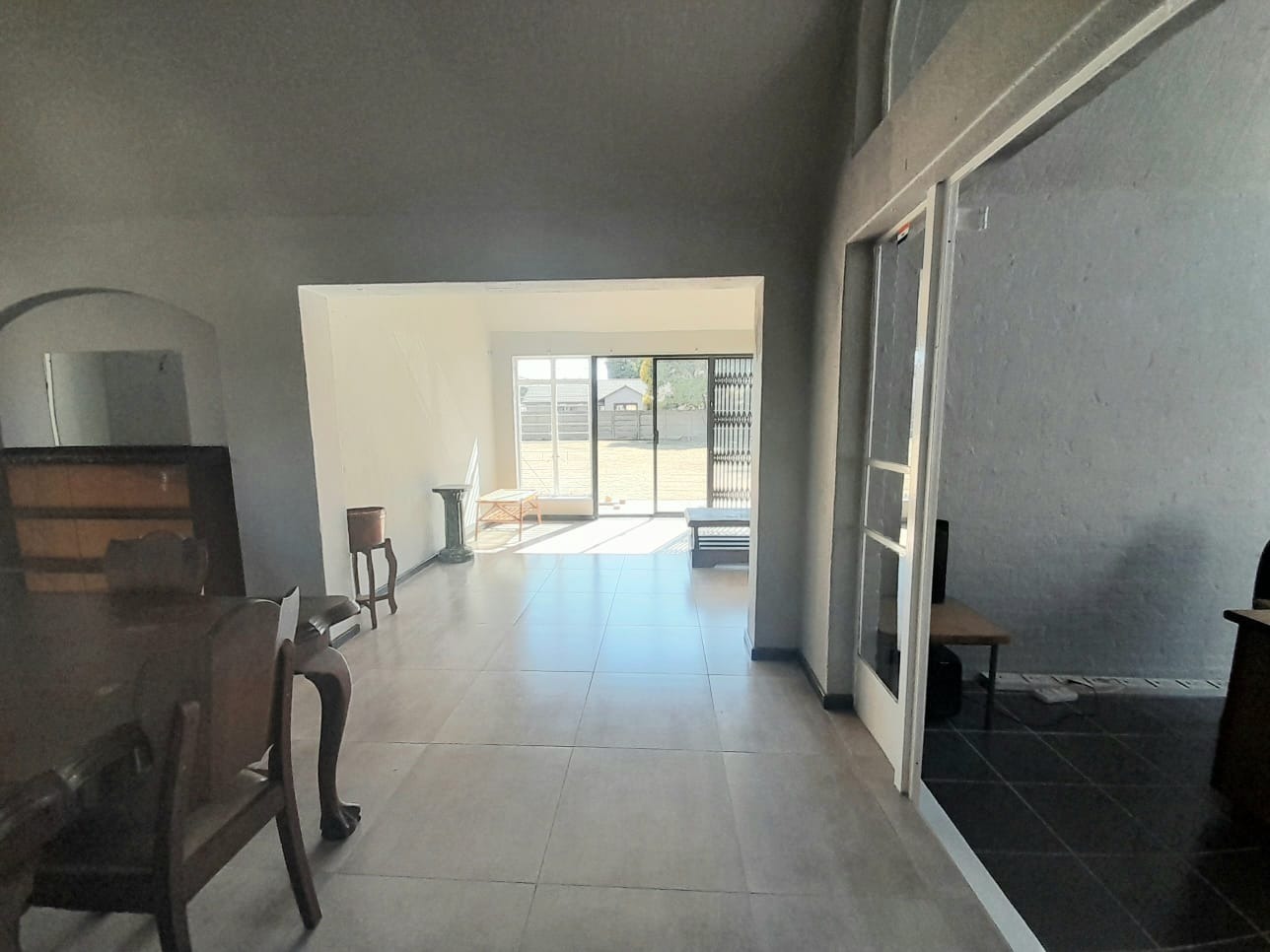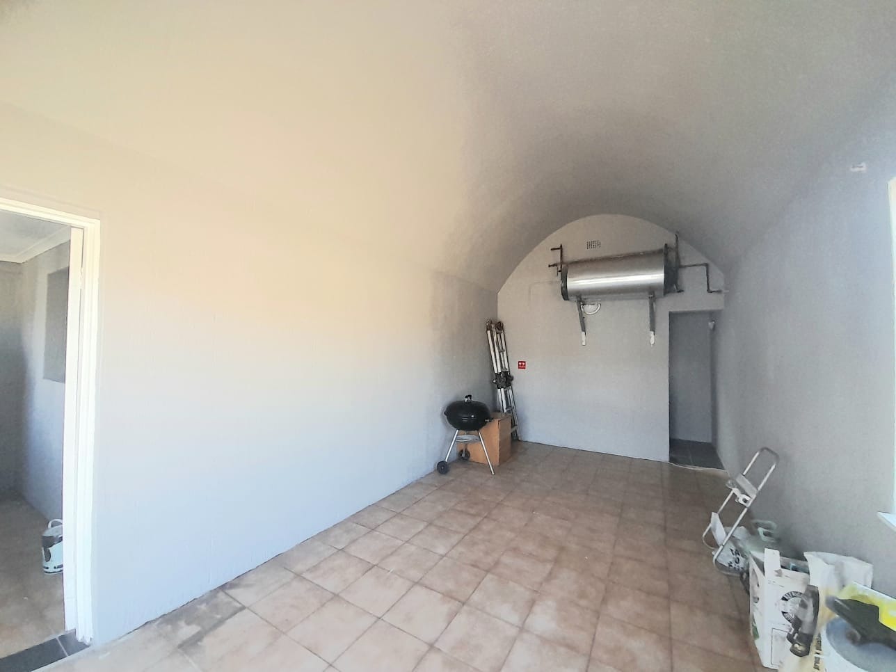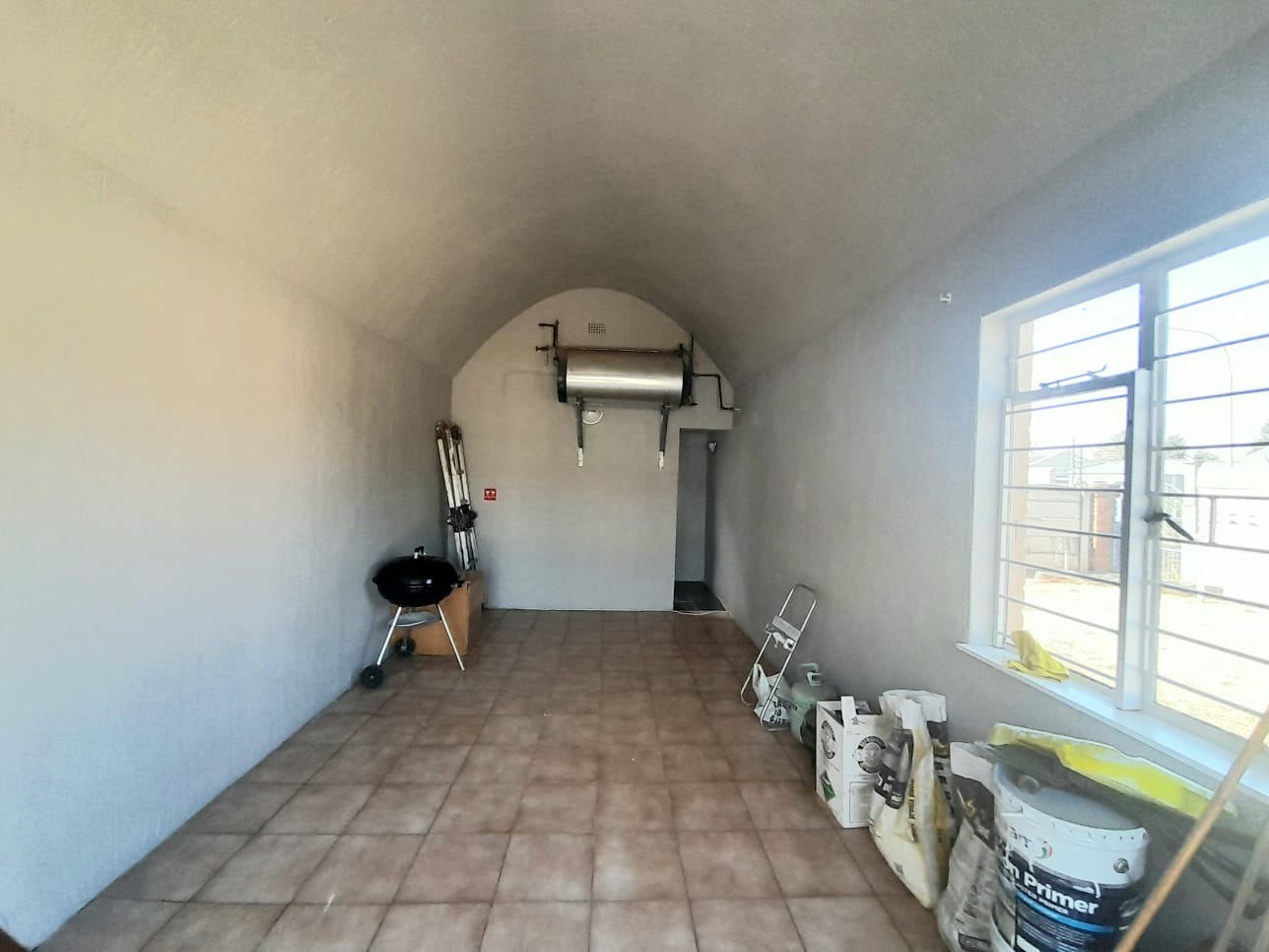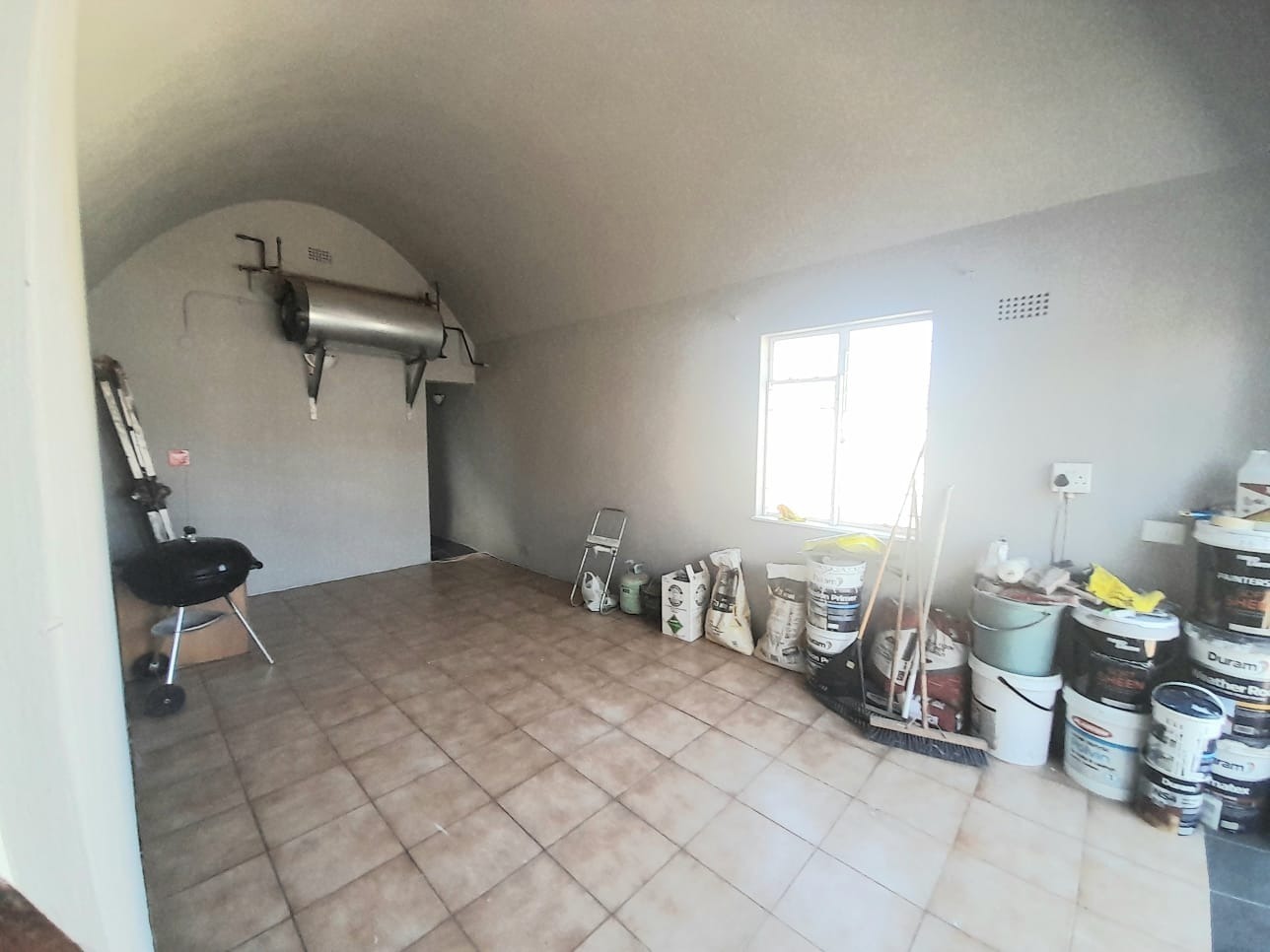 Step inside to find an interior distinguished by unique vaulted and arched ceilings creating a sense of spaciousness and light. The open-plan lounge with durable tiled flooring provides a versatile space for relaxation. Large sliding glass doors secured by robust security gates open to the exterior. The main kitchen equipped with dark wood cabinetry ample storage and a full-sized electric stove offers a functional space with vintage charm, complemented by a secondary utility kitchen.