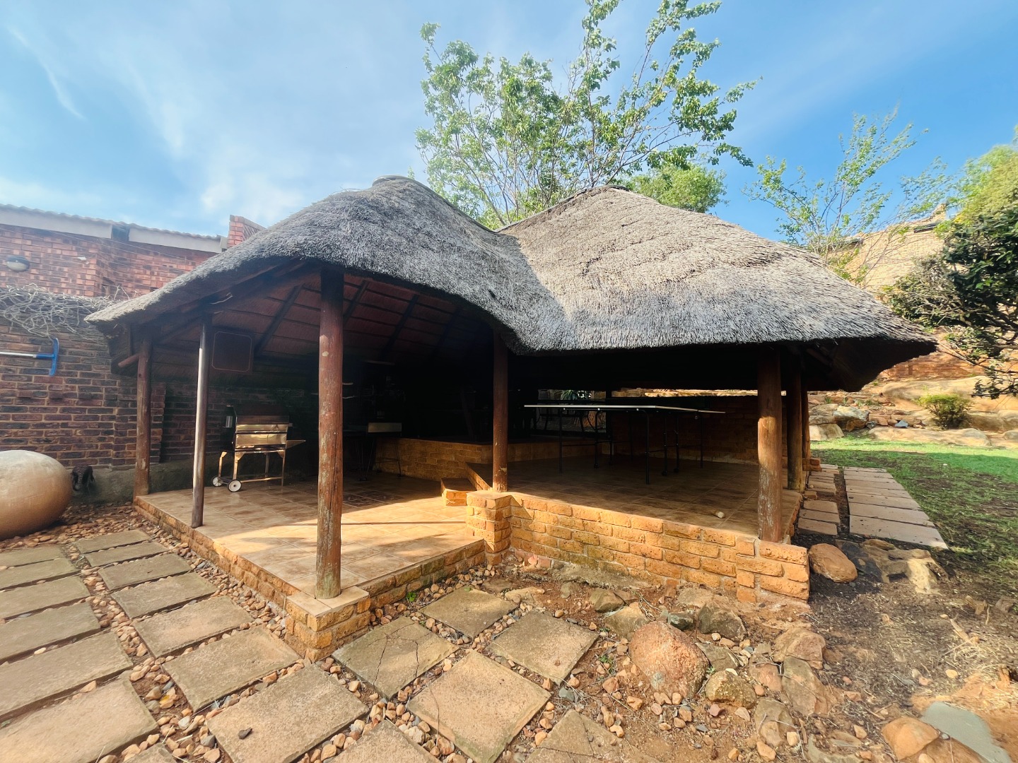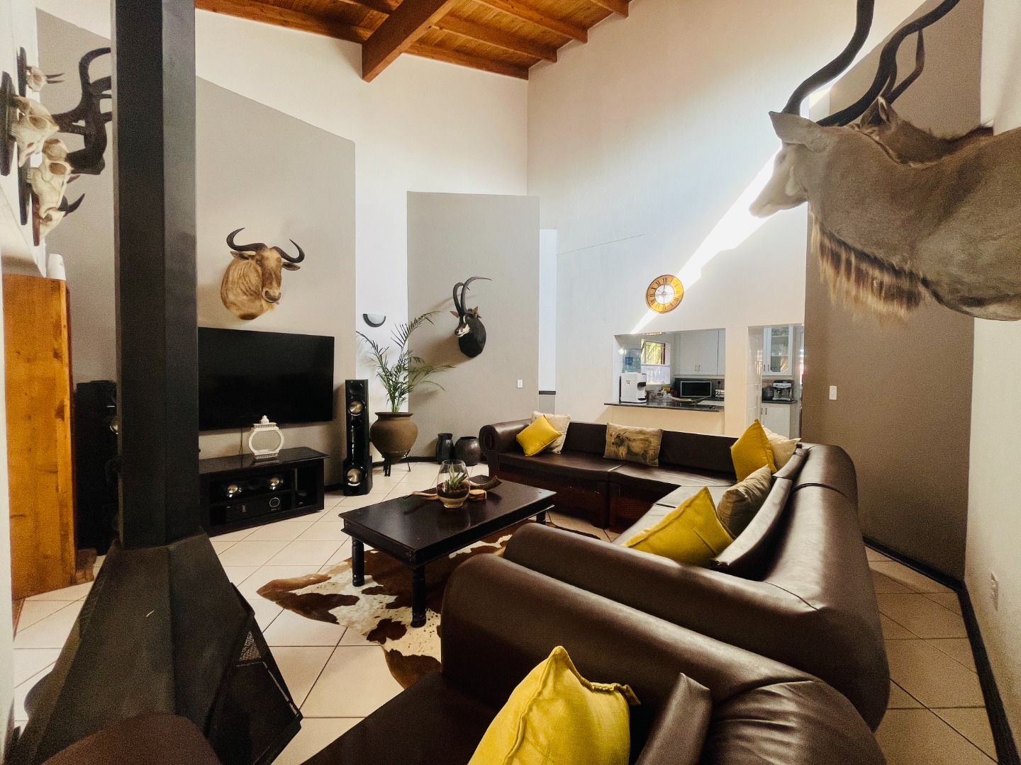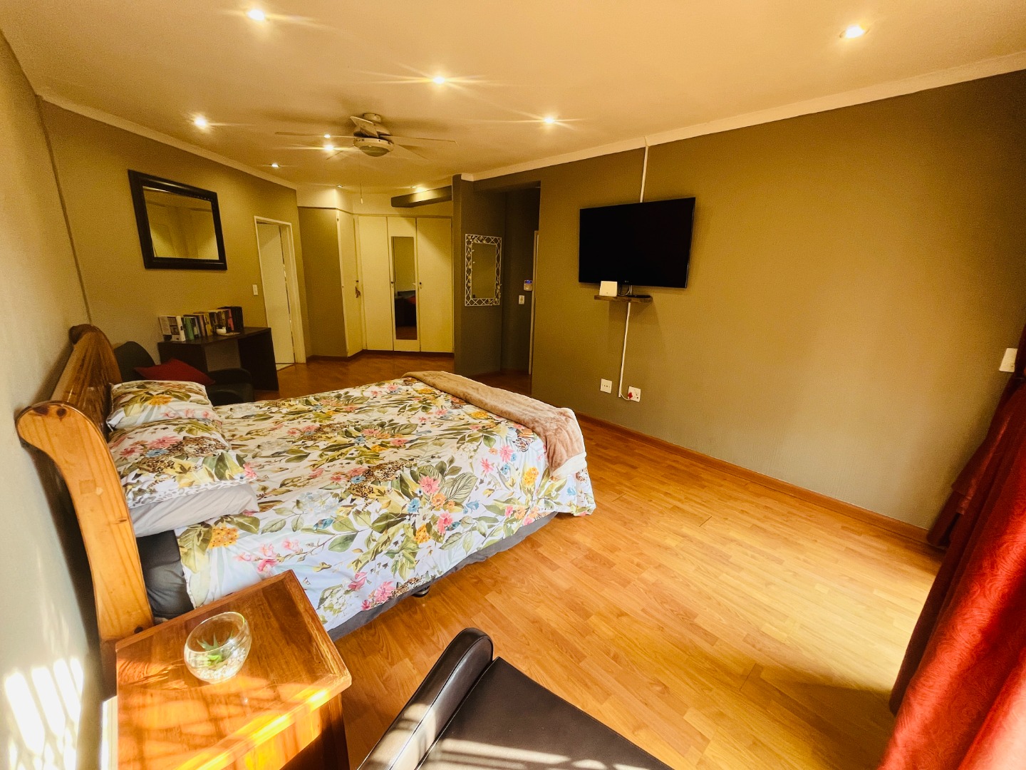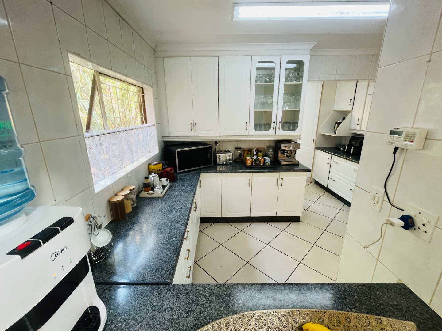 Step outside to find a stunning rockery swimming pool surrounded by a spacious, secure garden — ideal for children and pets to play freely. Two medium-sized Zoe-Zoe huts provide versatile outdoor storage for gardening tools or general household items. The spacious driveway offers ample parking space for guests and additional vehicles. The double automated garage includes built-in cupboards and offers direct access into the house, making everyday living effortless. The home also features a durable tiled roof structure and steel windows throughout.