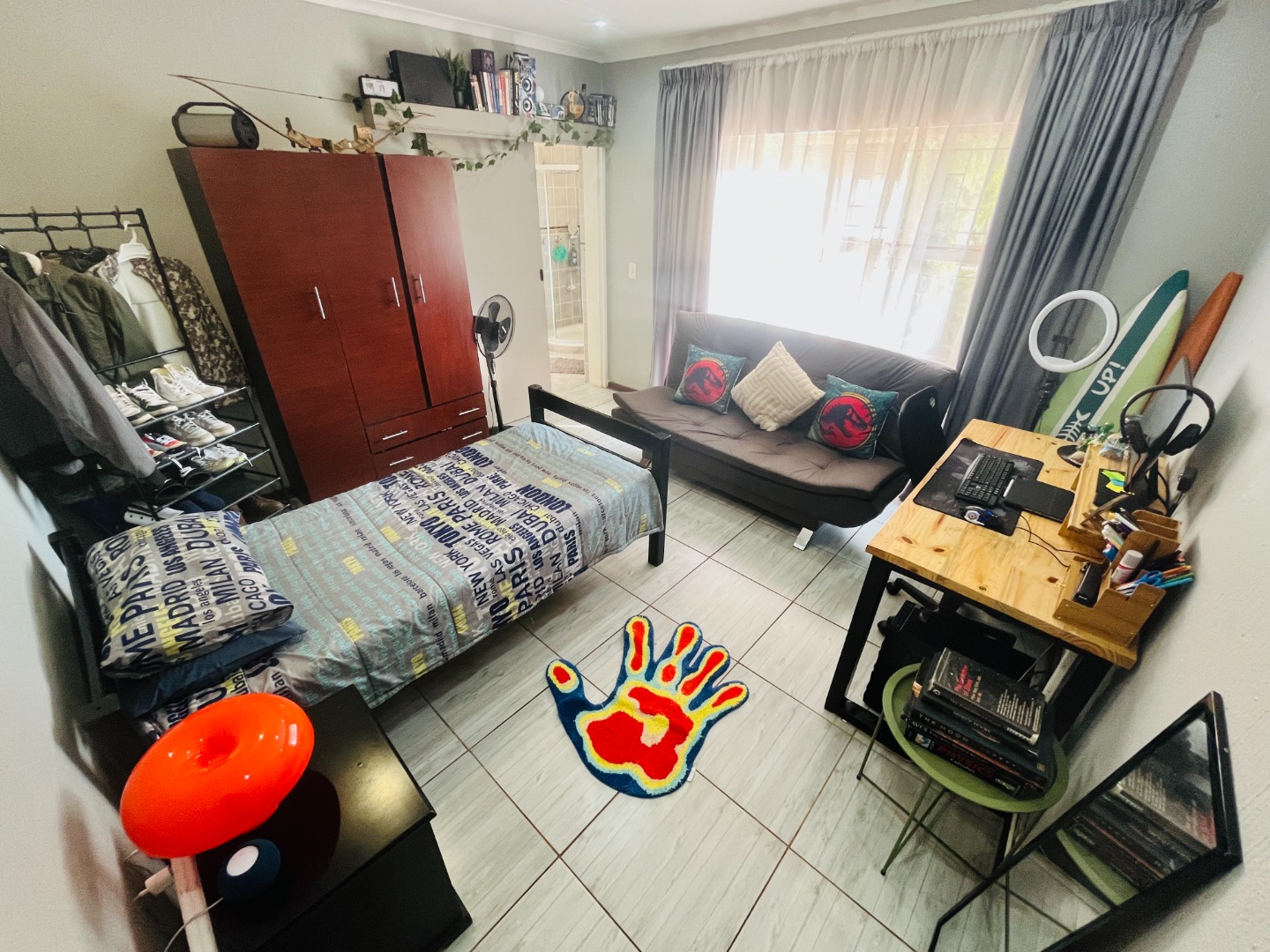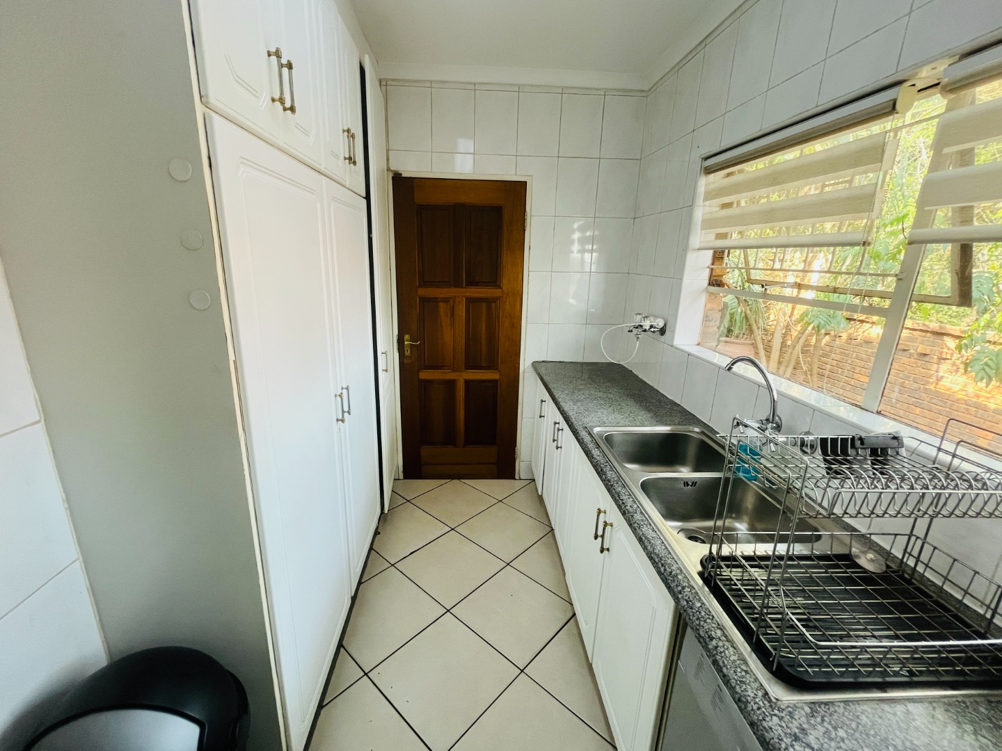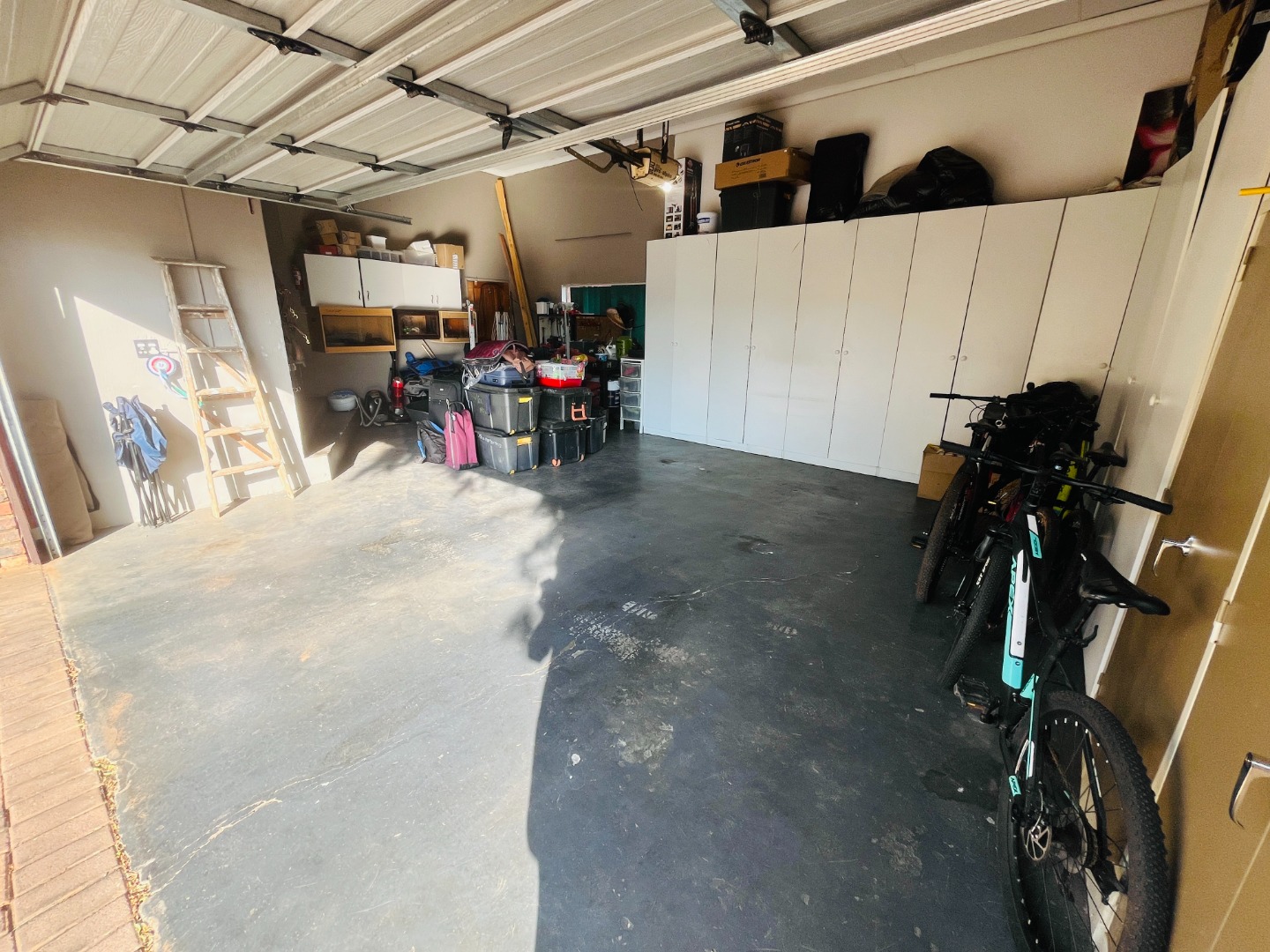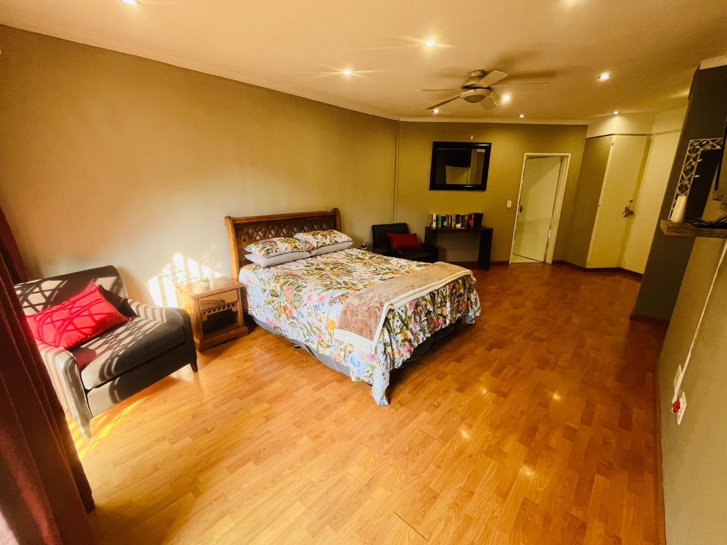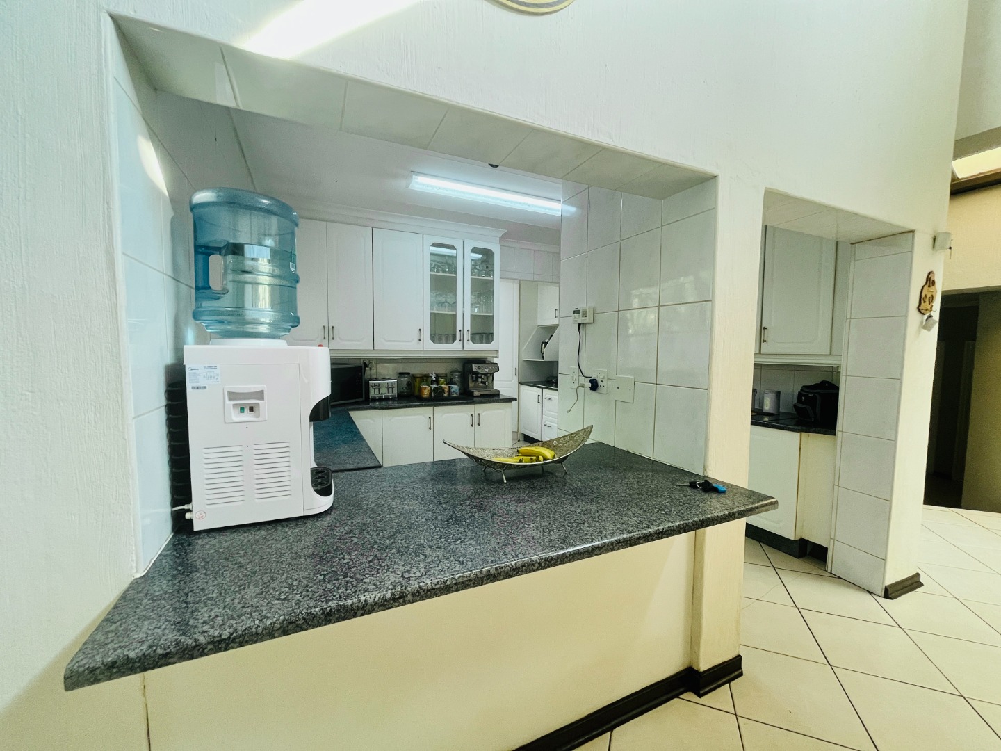 Step outside to find a stunning rockery swimming pool surrounded by a spacious, secure garden — ideal for children and pets to play freely. Two medium-sized Zoe-Zoe huts provide versatile outdoor storage for gardening tools or general household items. The spacious driveway offers ample parking space for guests and additional vehicles. The double automated garage includes built-in cupboards and offers direct access into the house, making everyday living effortless. The home also features a durable tiled roof structure and steel windows throughout.
