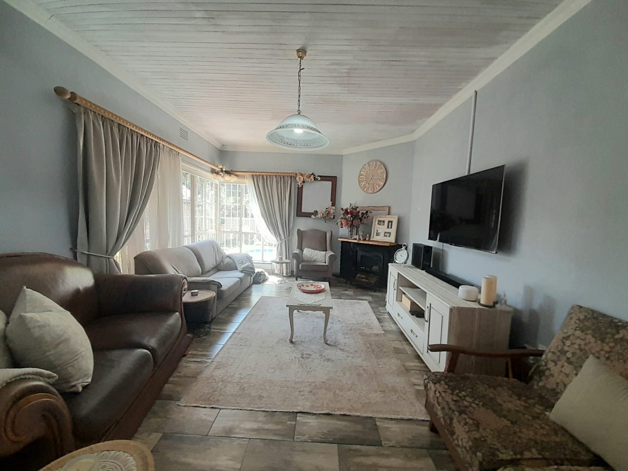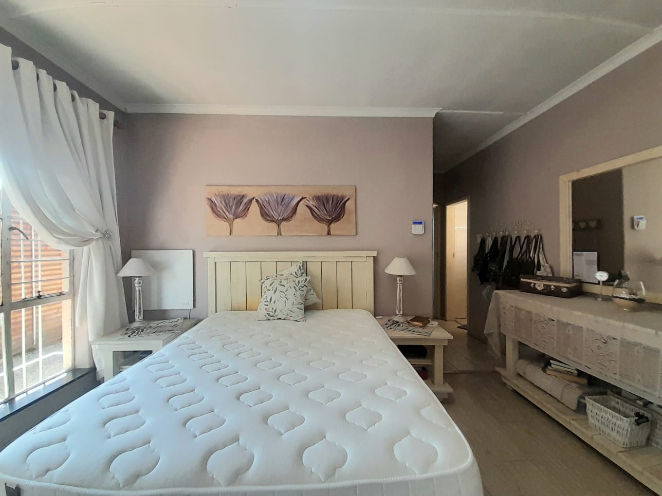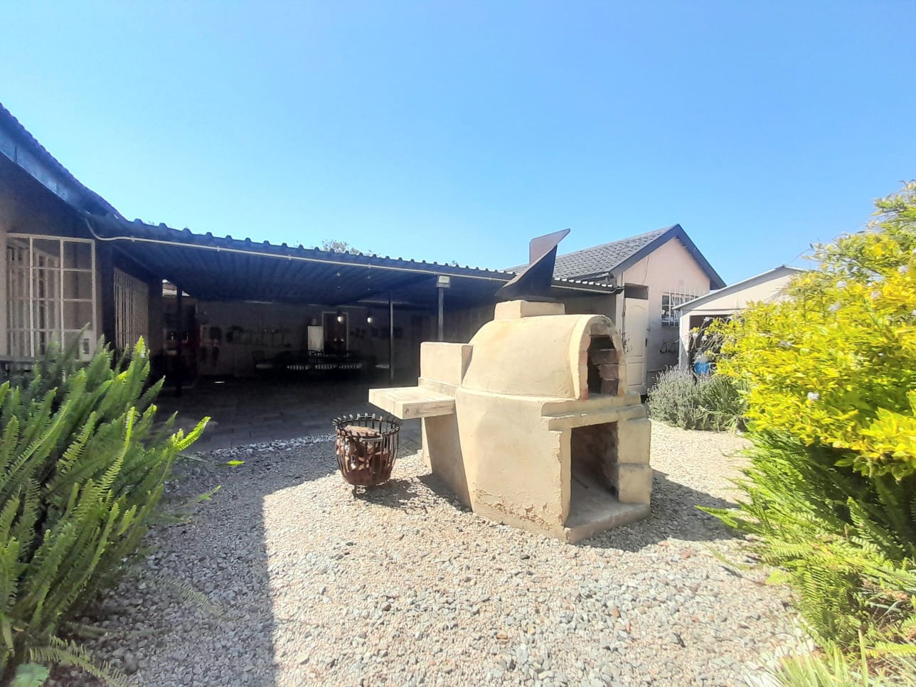 The main residence boasts a beautifully appointed antique-style kitchen, complete with a gas stove, and flows seamlessly into the open-plan dining area and lounge, where a cozy fireplace awaits chilly evenings. Laminated flooring throughout the living areas adds a touch of sophistication, while spacious passages lead to 3 spacious bedrooms with built-in cupboards. 2 modern bathrooms 1 being an en-suite.