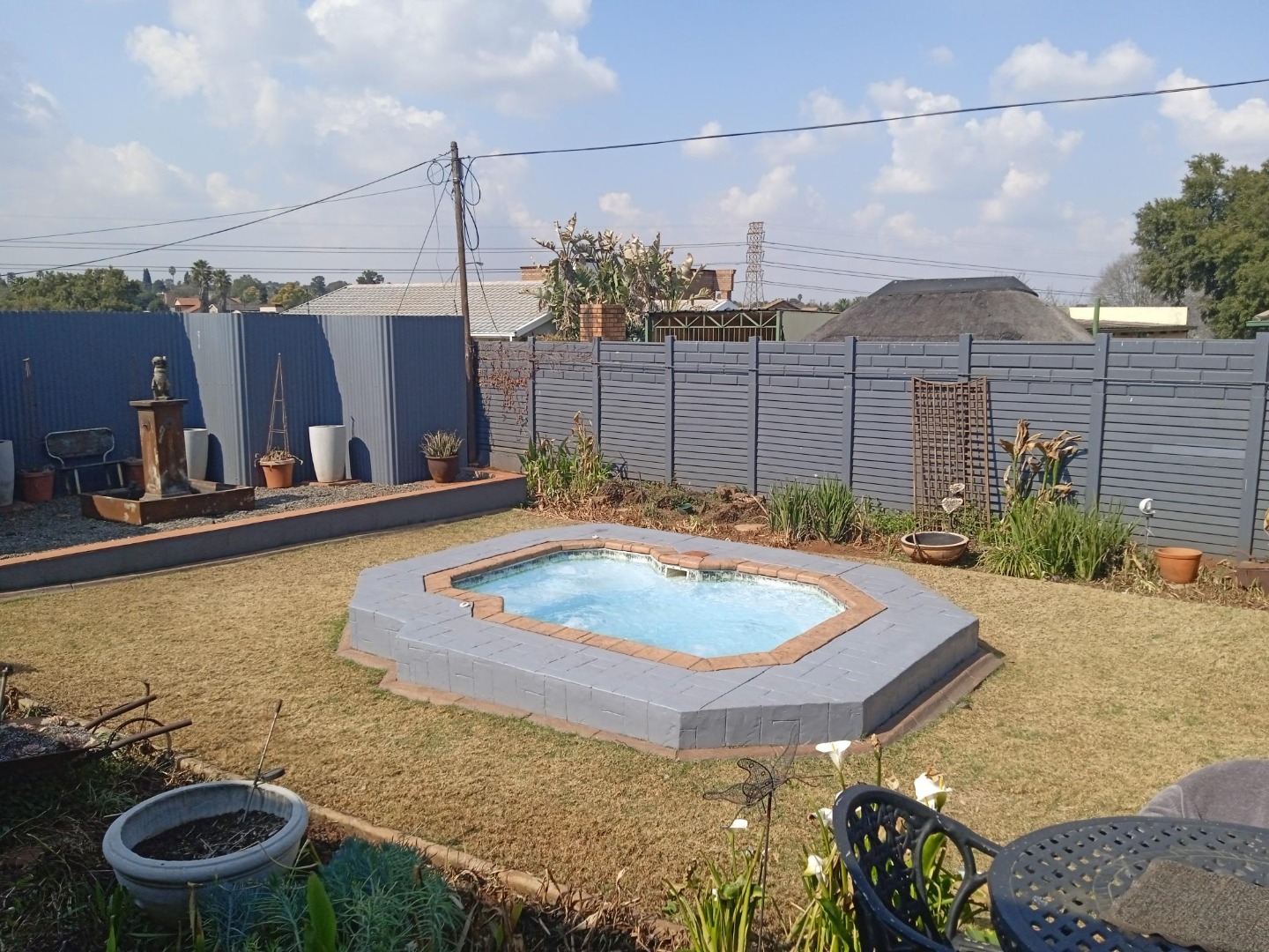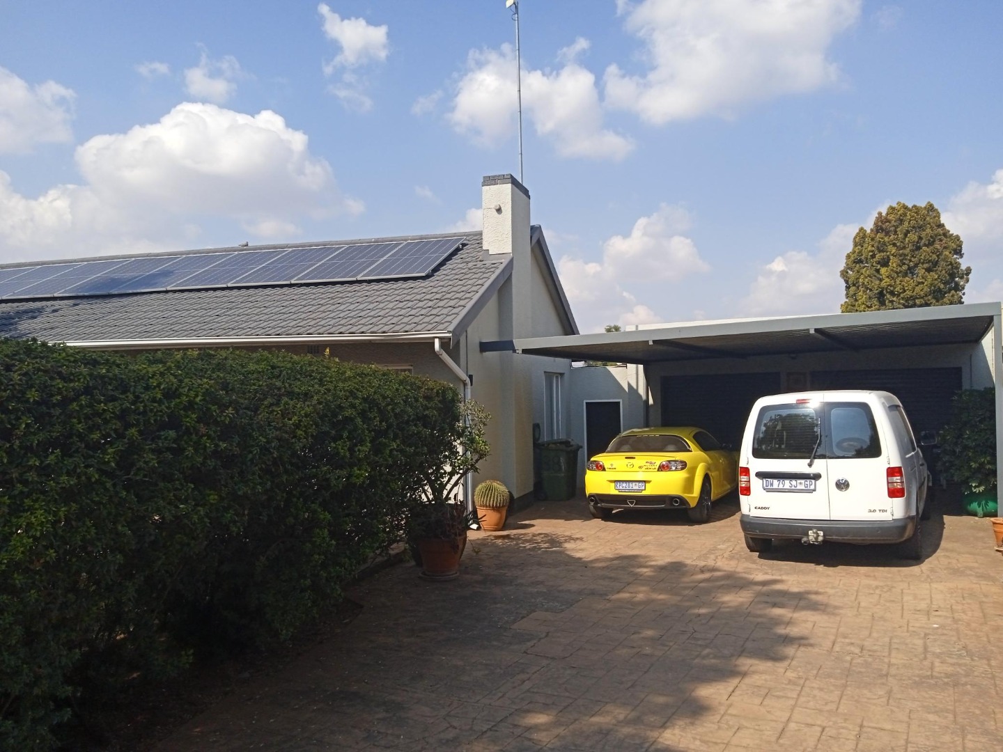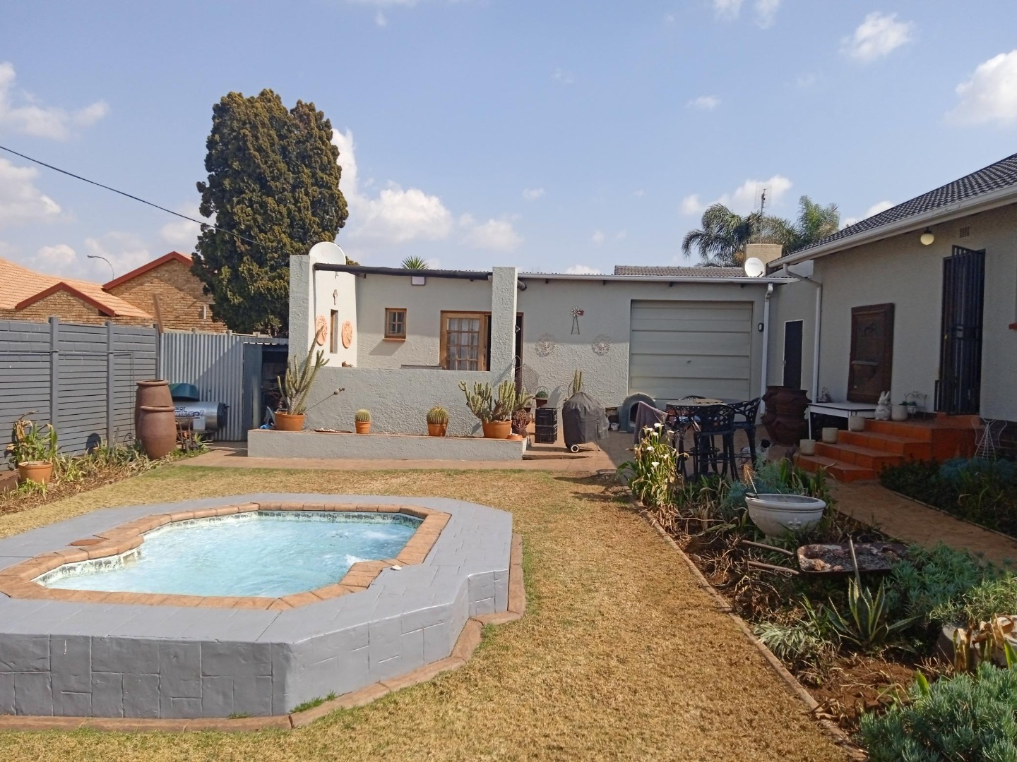 Discover this charming 3-bedroom, 1-bathroom home nestled in the established suburban area of Verwoerdpark, Alberton, South Africa. This property immediately impresses with its well-maintained exterior, featuring a paved driveway leading to a double carport and an array of solar panels, hinting at energy efficiency. The lush, mature garden with tropical plants and a neatly trimmed hedge enhances its kerb appeal, creating a welcoming first impression. Step inside to an inviting interior that boasts an open-plan layout, seamlessly connecting the living spaces. The kitchen is a highlight, equipped with extensive traditional wooden cabinetry, light-colored countertops, a modern white tiled backsplash, and a gas stove, perfect for culinary enthusiasts. A dedicated dining room and a comfortable lounge provide ample space for relaxation and entertaining. The home offers three well-proportioned bedrooms, ensuring comfortable accommodation. The single bathroom has been tastefully updated with a modern, clean aesthetic, featuring a stylish freestanding bathtub, wall-mounted toilet, and contemporary fixtures, providing a serene retreat. Outdoor living is a delight with a private garden and an outdoor hot tub/small pool, ideal for unwinding. The property also includes a laundry area and is pet-friendly, catering to a family lifestyle. Parking is generous with a double garage and additional space for up to six vehicles. Security is well-addressed with electric fencing and burglar bars on windows, offering peace of mind. Sustainability features include a solar geyser and a battery inverter, contributing to reduced utility costs and reliable power. This metropolitan and suburban setting provides convenient access to local amenities and a peaceful residential environment. Key Features: • 3 Bedrooms, 1 Bathroom (1 En-suite, 1 Guest Toilet) • Open Plan Living Areas • Well-equipped Kitchen with Gas Stove • Outdoor Hot Tub/Small Pool • Double Garage & 6 Parking Spaces • Solar Panels, Solar Geyser & Battery Inverter • Electric Fencing & Burglar Bars • Pet-Friendly with Garden