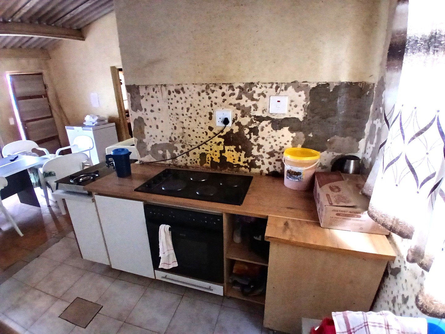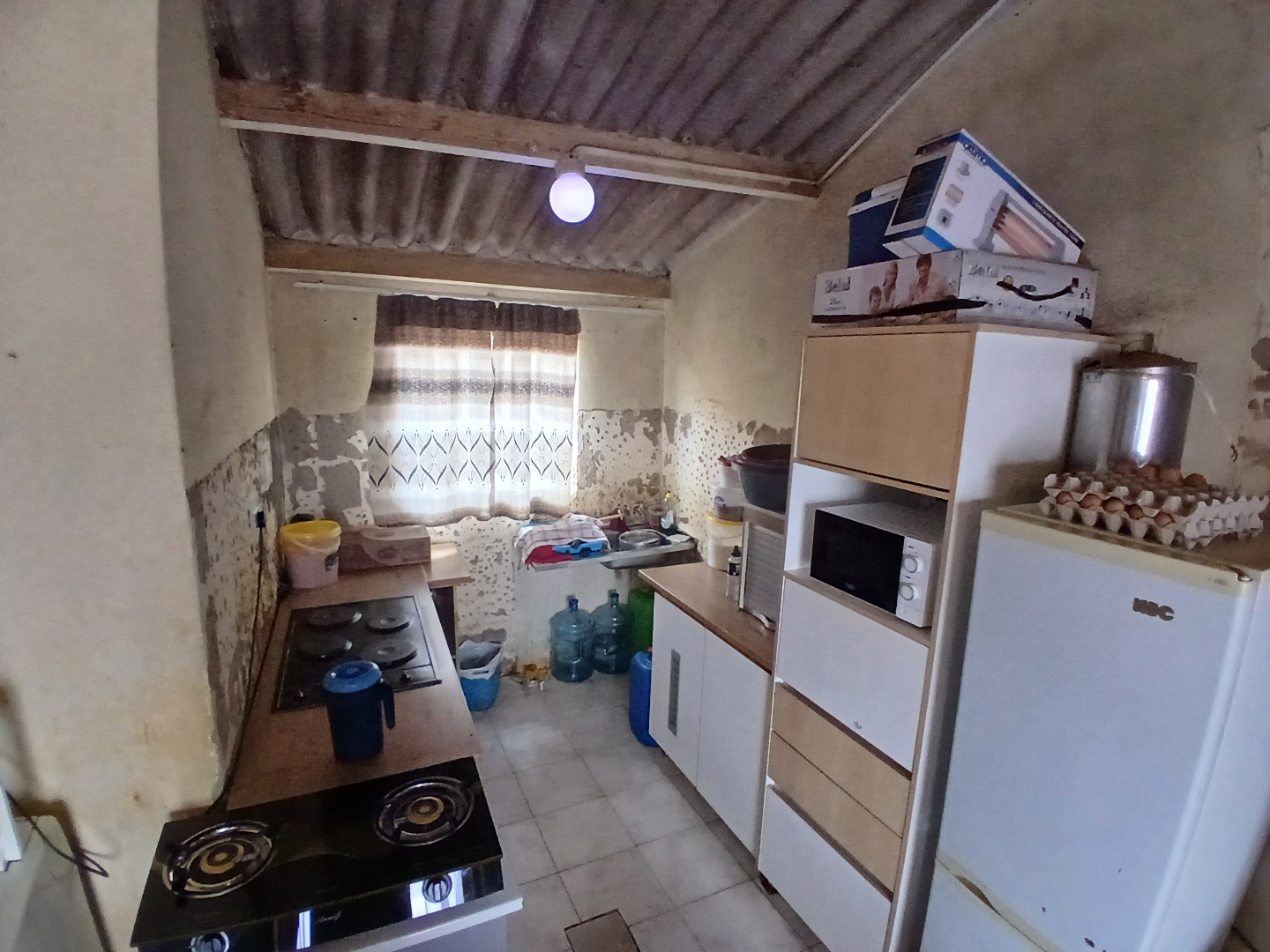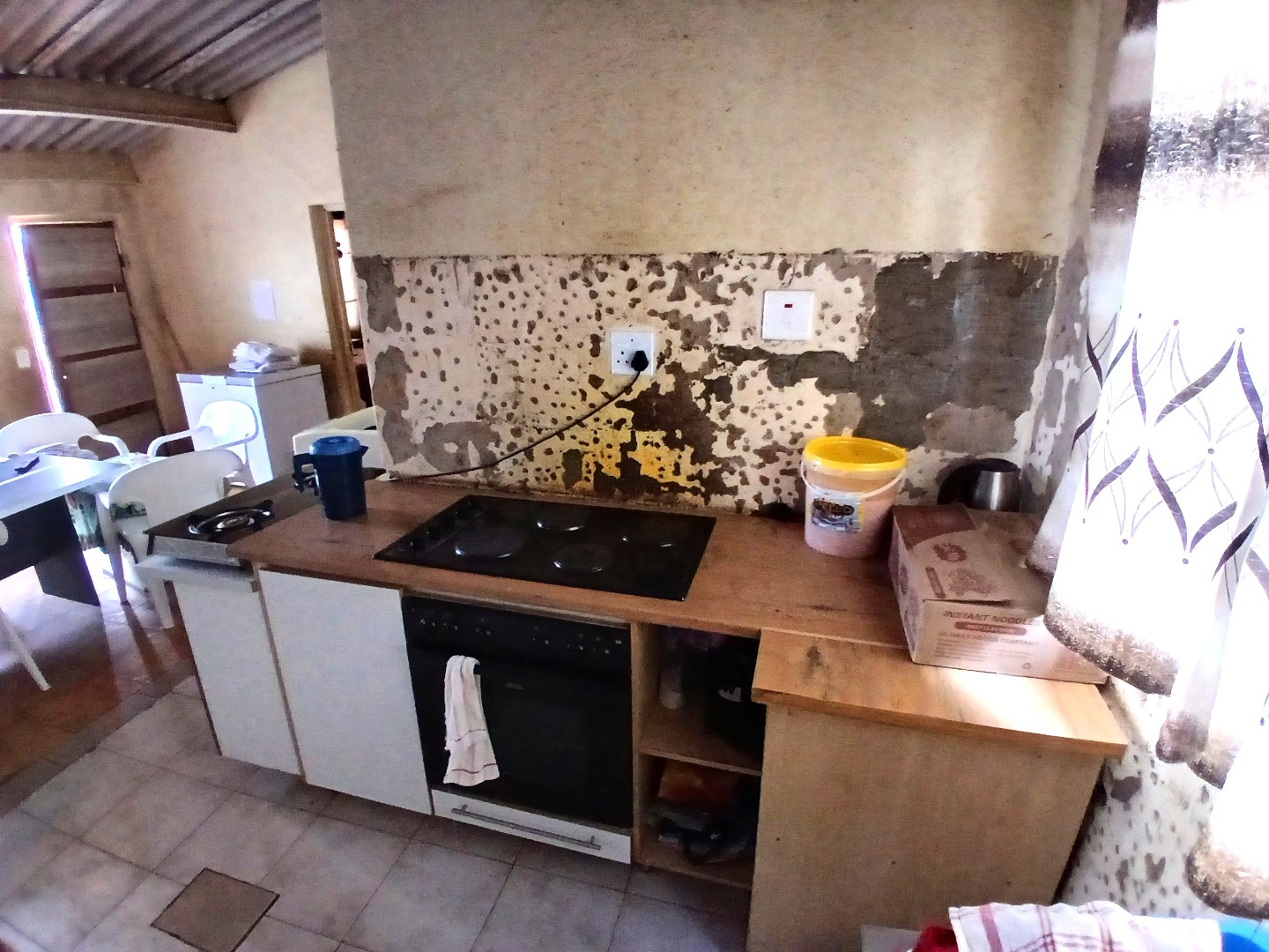 Inside the main house offers a functional layout comprising one lounge and a kitchen. The kitchen while equipped with basic appliances and cabinetry currently shows signs of wea including peeling paint and an exposed corrugated ceiling. This space is ripe for a complete overhaul allowing new owners to design a modern open-plan living area tailored to their preferences transforming it into a vibrant hub for daily life.