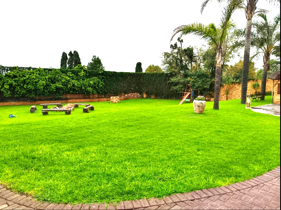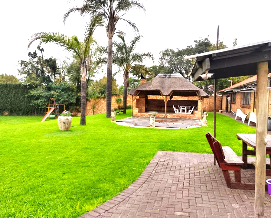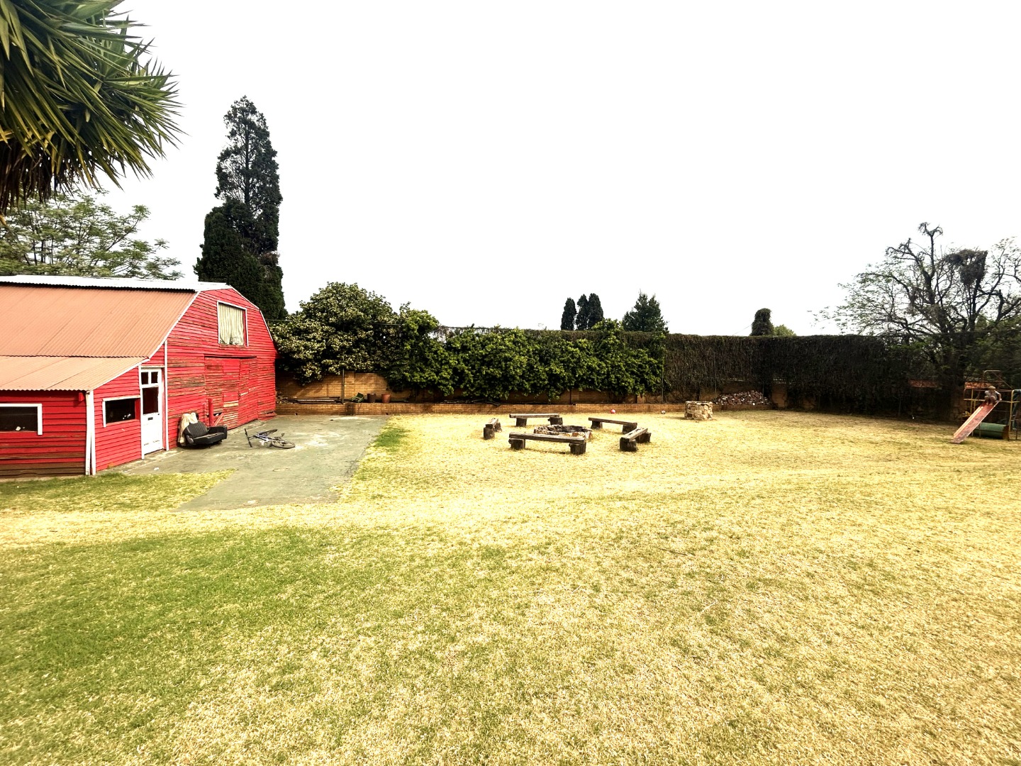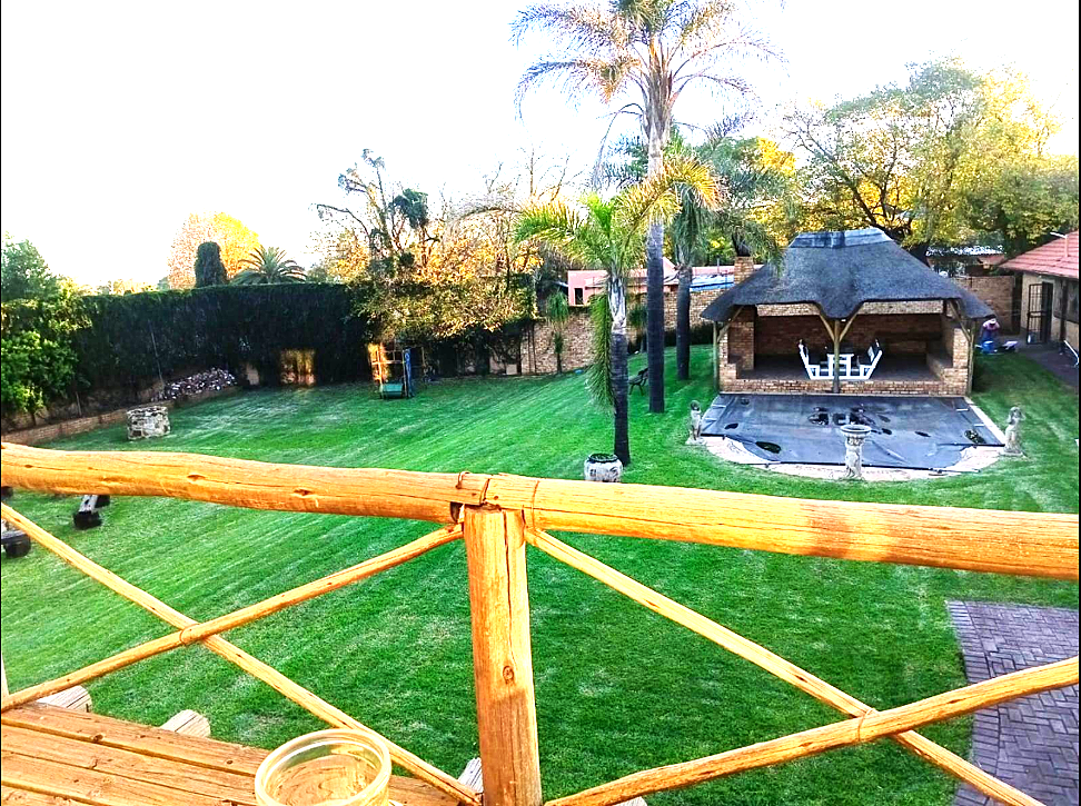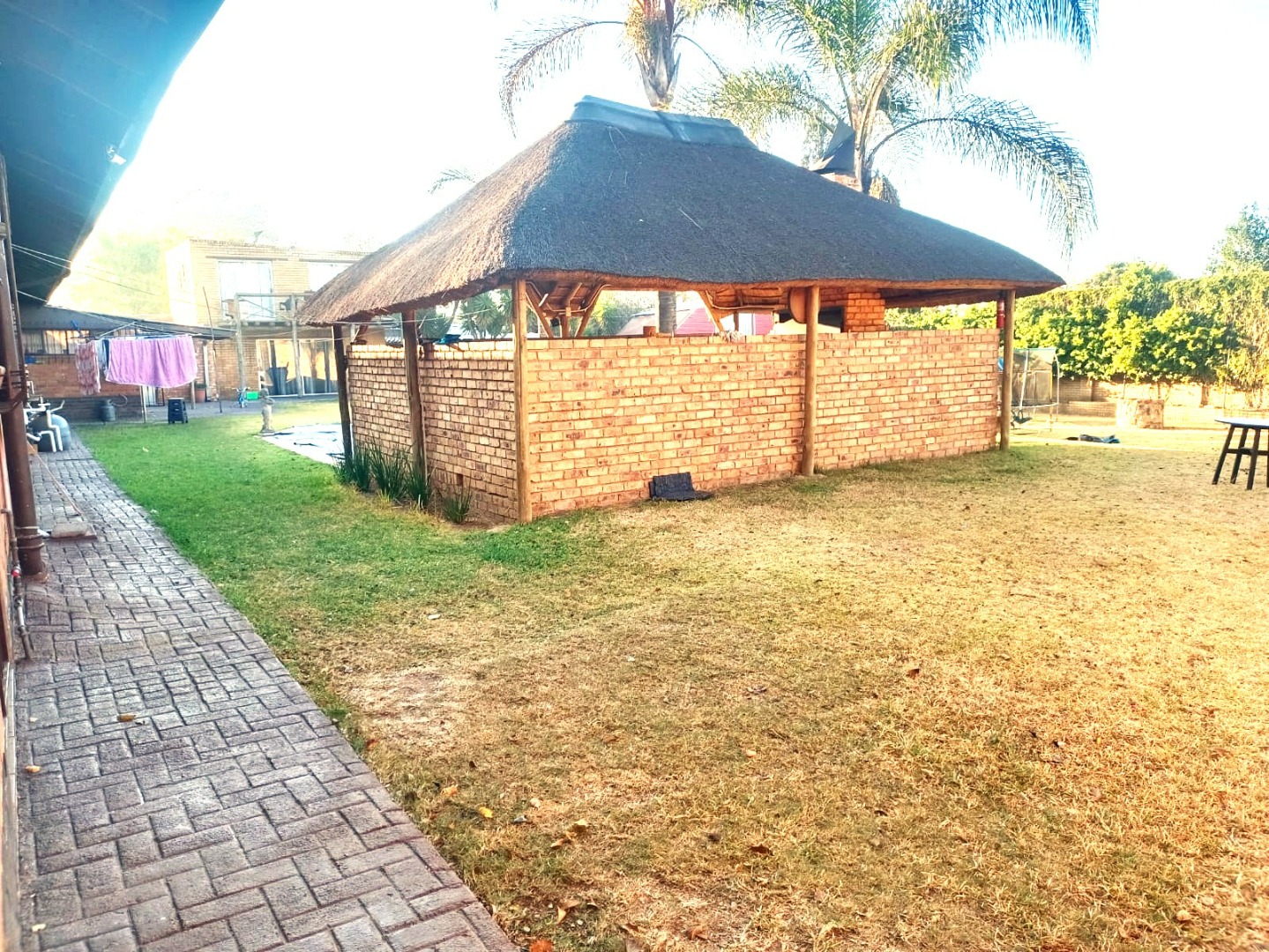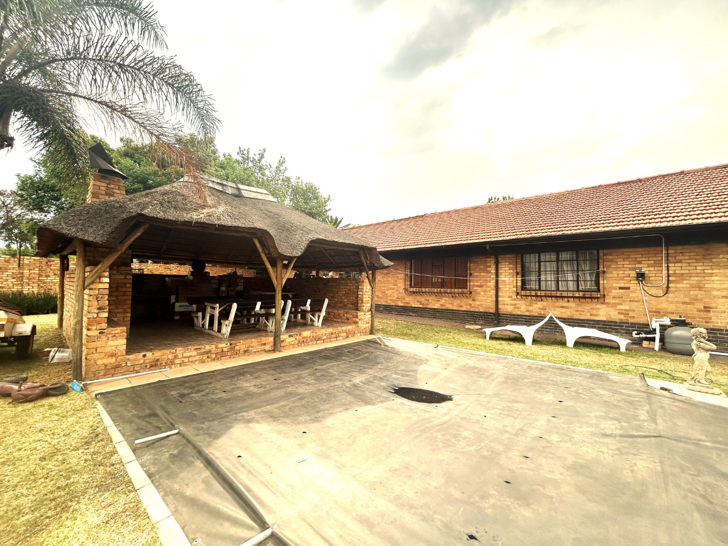 Outdoor living is a highlight, featuring a large garden with mature trees, a covered swimming pool for leisure, and a spacious patio perfect for relaxation. The property also includes a charming thatch-roof lapa, providing an ideal setting for outdoor entertaining. An elevated wooden balcony offers additional outdoor space, complementing the extensive yard which also features a fire pit area and a children's play area with a swing set. Parking is abundant with four garages and ten additional open parking spaces, ensuring ample room for vehicles.