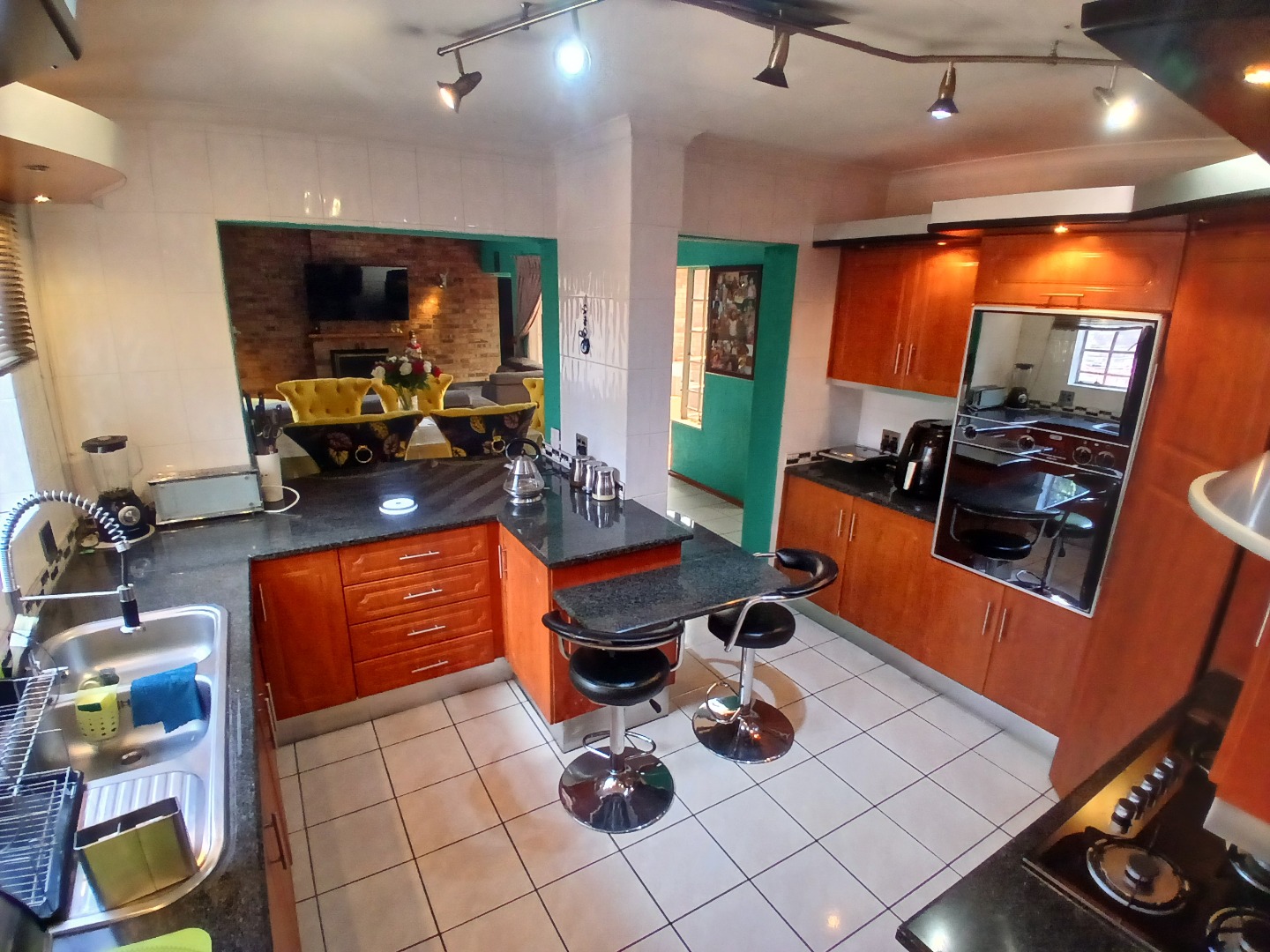 Step inside to an inviting open plan layout featuring a spacious lounge and dining area adorned with striking vaulted ceilings and exposed wooden beams, adding architectural character. A cozy brick accent wall with a fireplace enhances the living space. The well equipped kitchen is a highlight offering warm wood cabinetry, dark granite countertops and integrated modern appliances including a hob, oven, microwave and a dishwasher. An integrated breakfast bar provides convenient seating while track lighting ensures a bright and functional culinary environment.