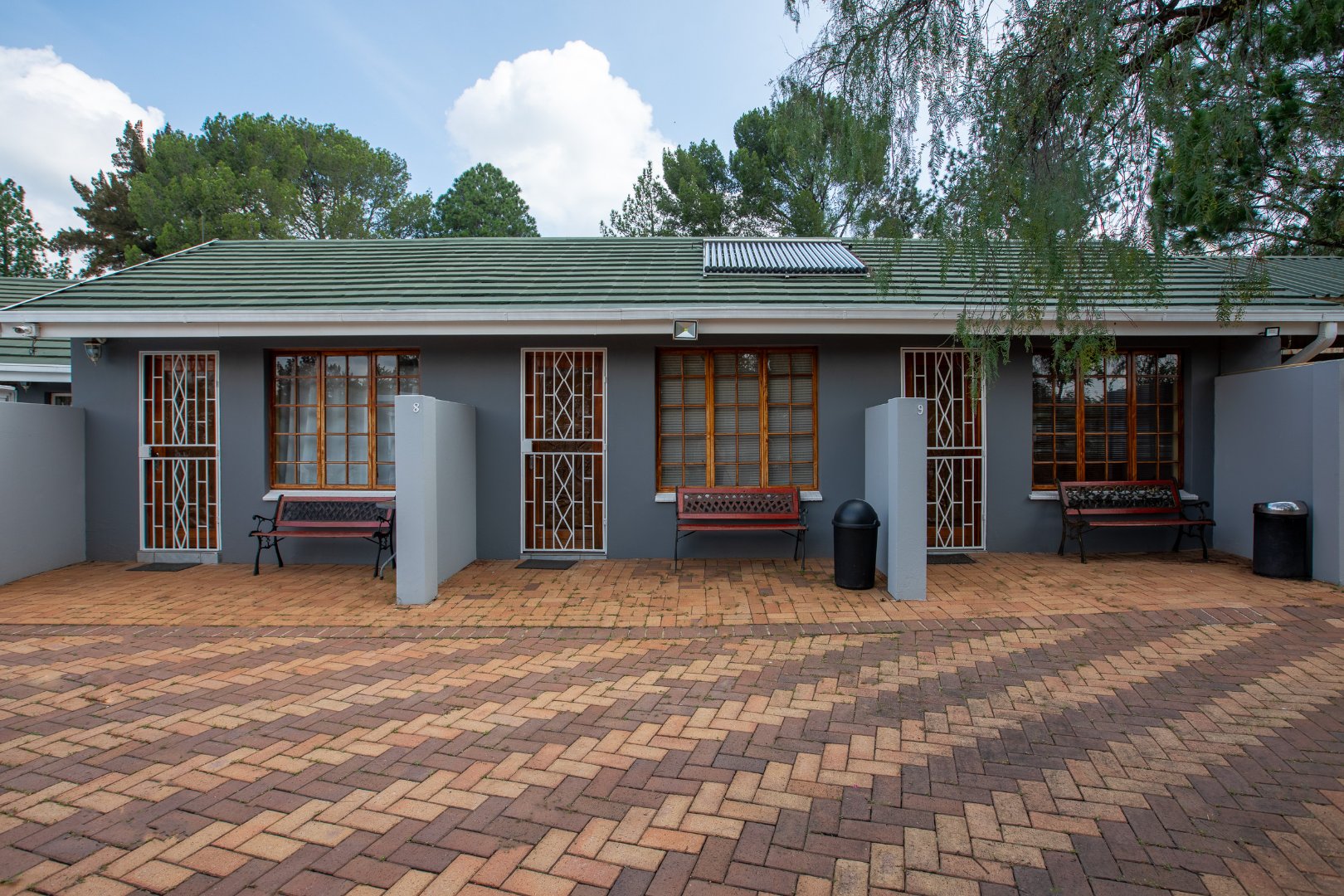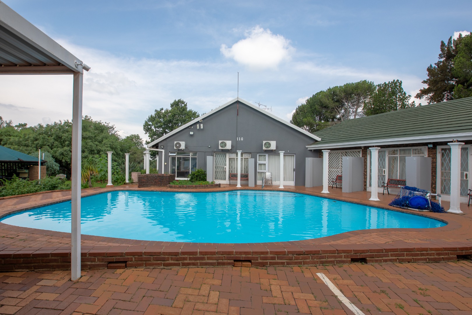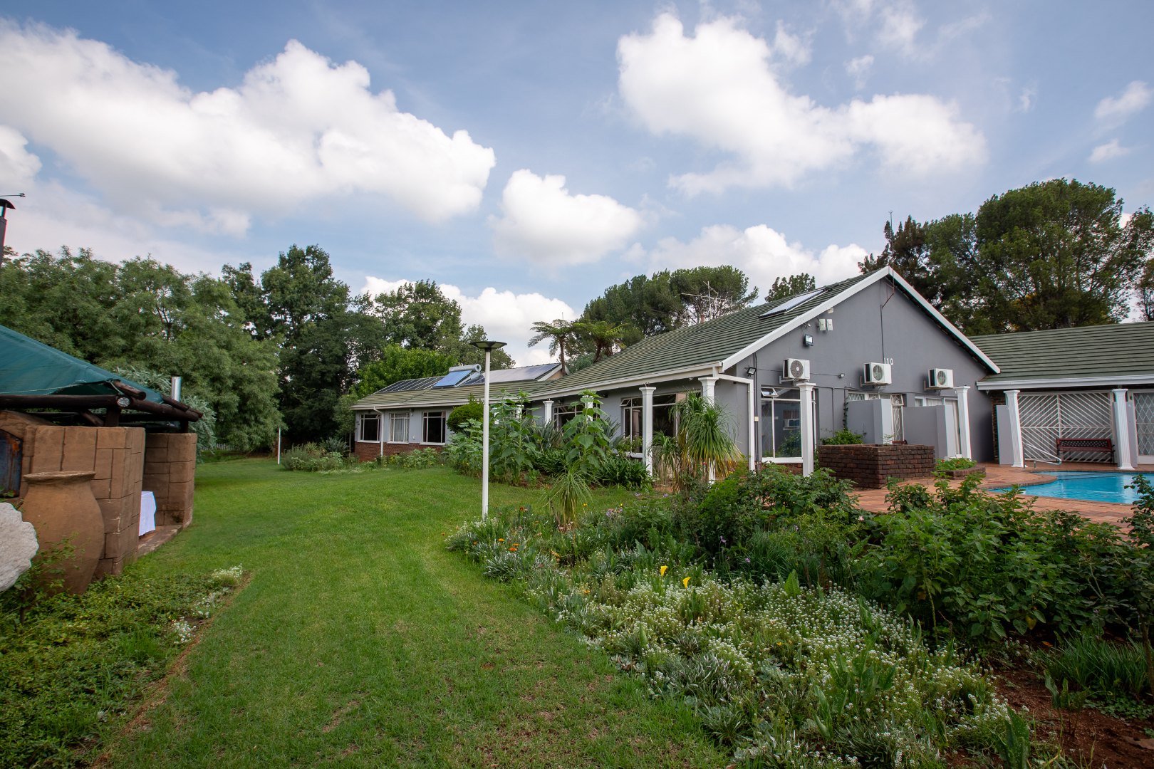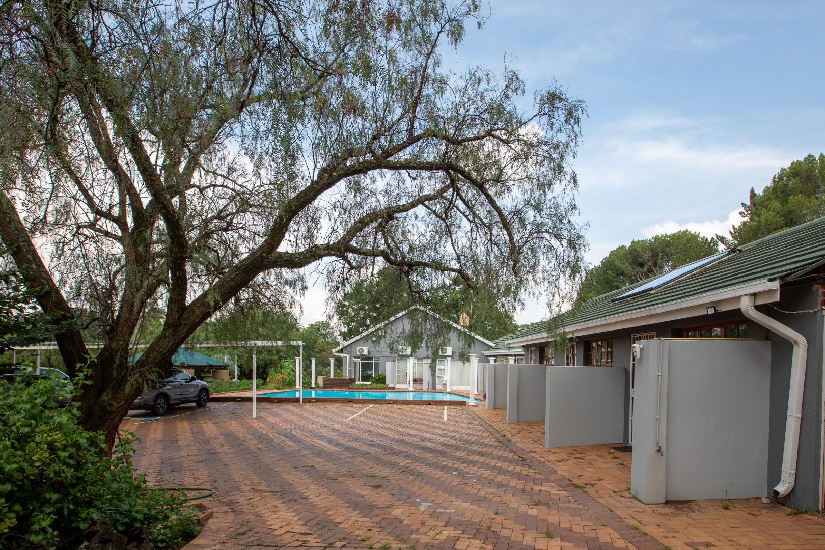 Outside you will find six well-appointed cottages – two fully self-catering – ideal for short- or long-term stays. With all furniture included these homes are ready to go. Guests or family can enjoy the sparkling pool filled with borehole water, lush botanical gardens and shared braai or outside preparation area – all in a pet-friendly setting!