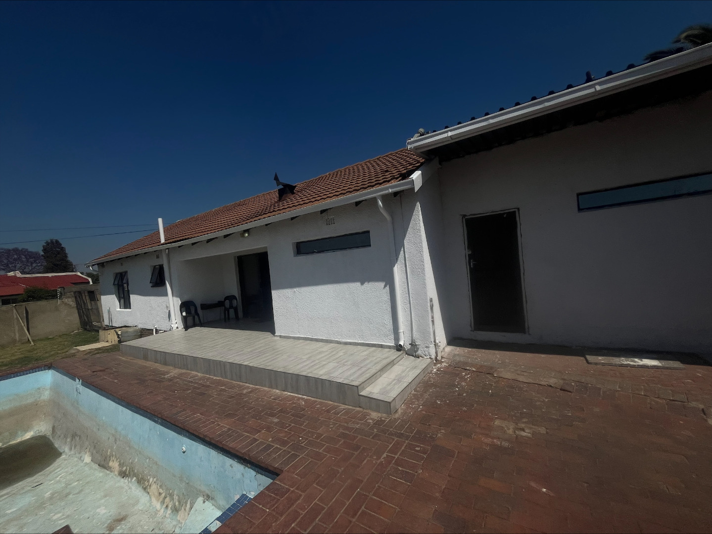 Outdoors the property presents a generous garden with paving and a tiled patio/veranda ideal for outdoor enjoyment. While the swimming pool currently requires renovation it represents a fantastic opportunity to create a private oasis for leisure and entertainment complete with a braai room. Pets are welcome making this a true family haven.