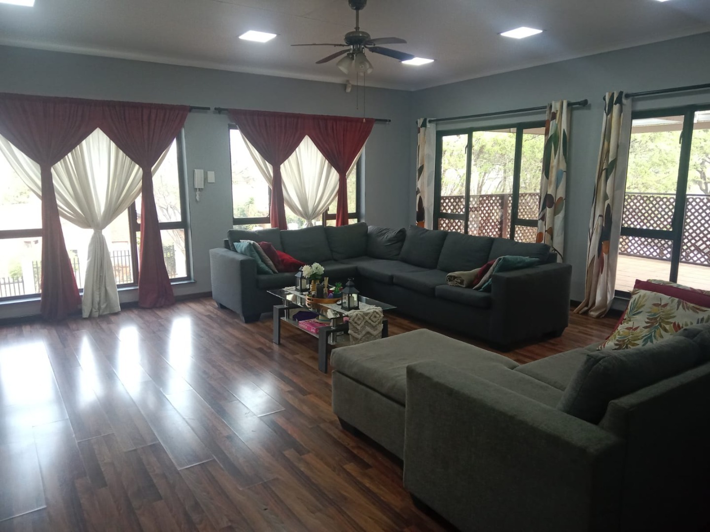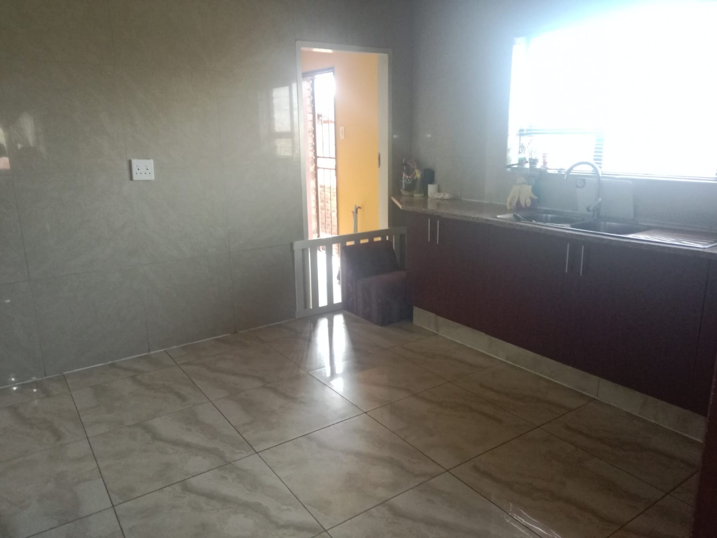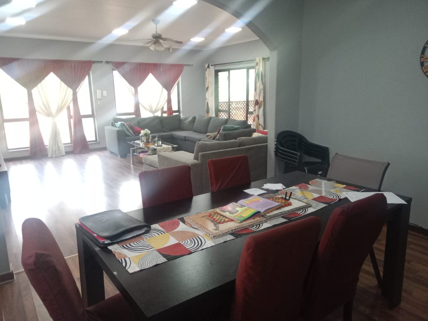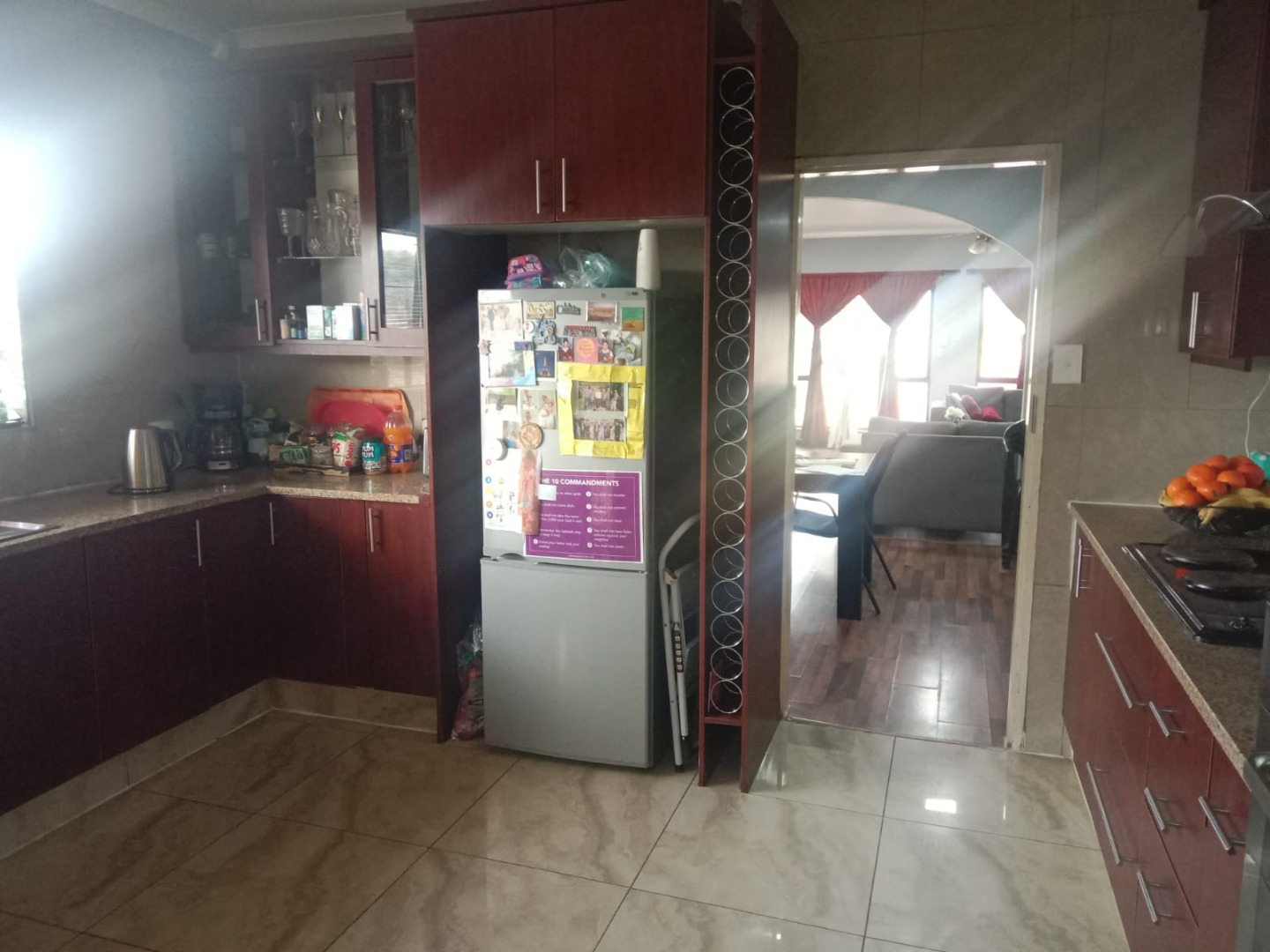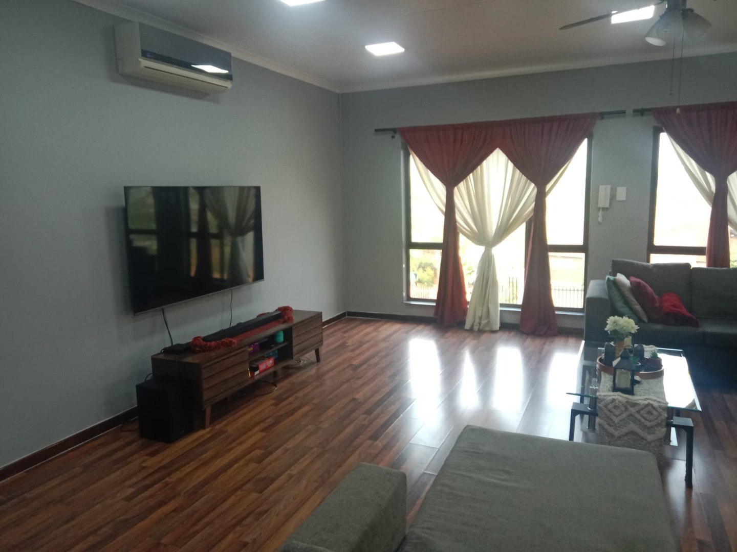 This inviting four bedroom, two bathroom residence, including one on-suite, is nestled in Mulbarton, Johannesburg. Designed for comfortable family living the home boasts an impressive open-plan layout connecting the living, dining and kitchen areas. The spacious lounge and dining room are bathed in natural light featuring modern wood-look laminate flooring and neutral walls complemented by an air conditioning unit and ceiling fan for comfort. An elegant arched entryway adds architectural interest.