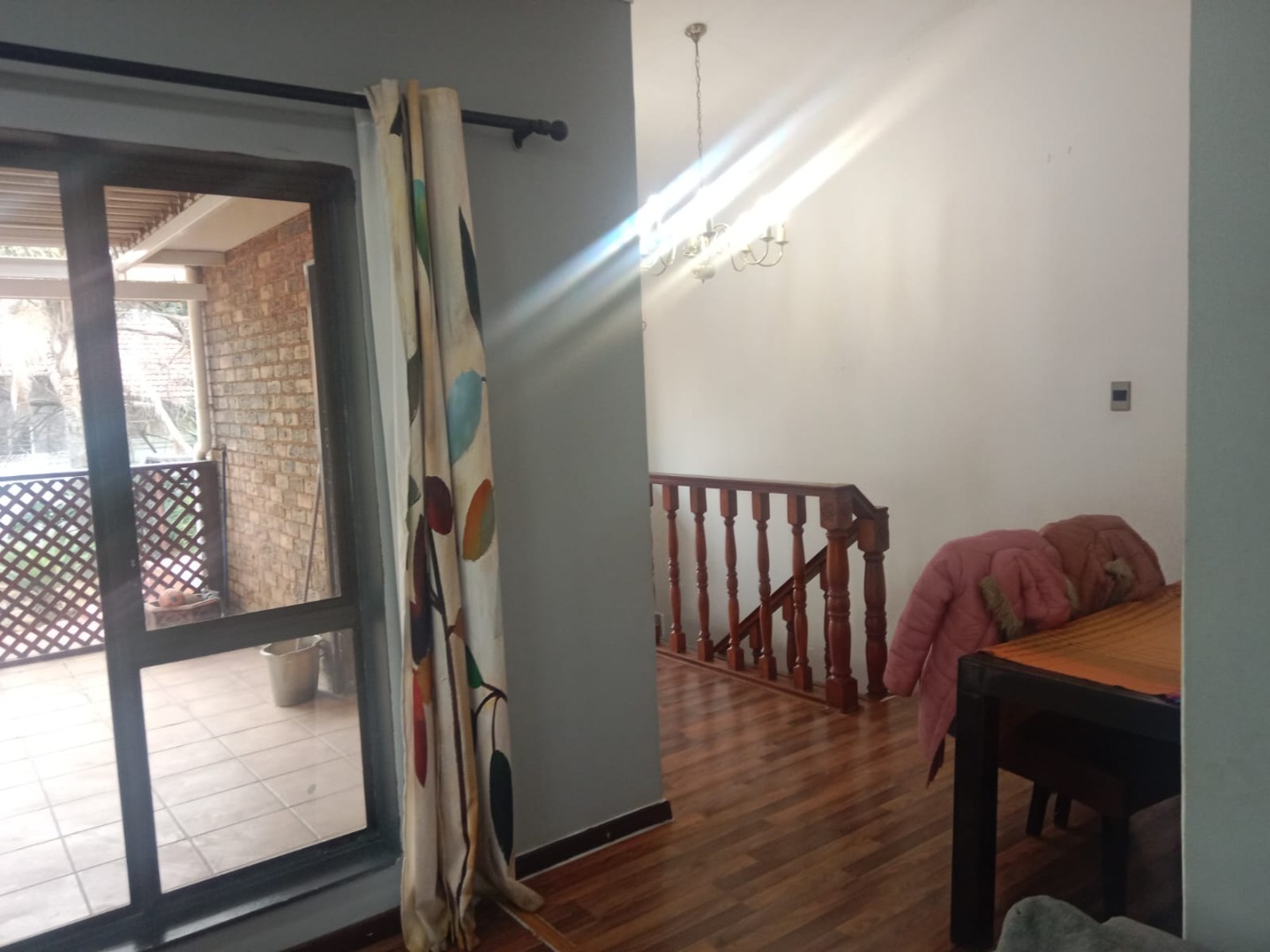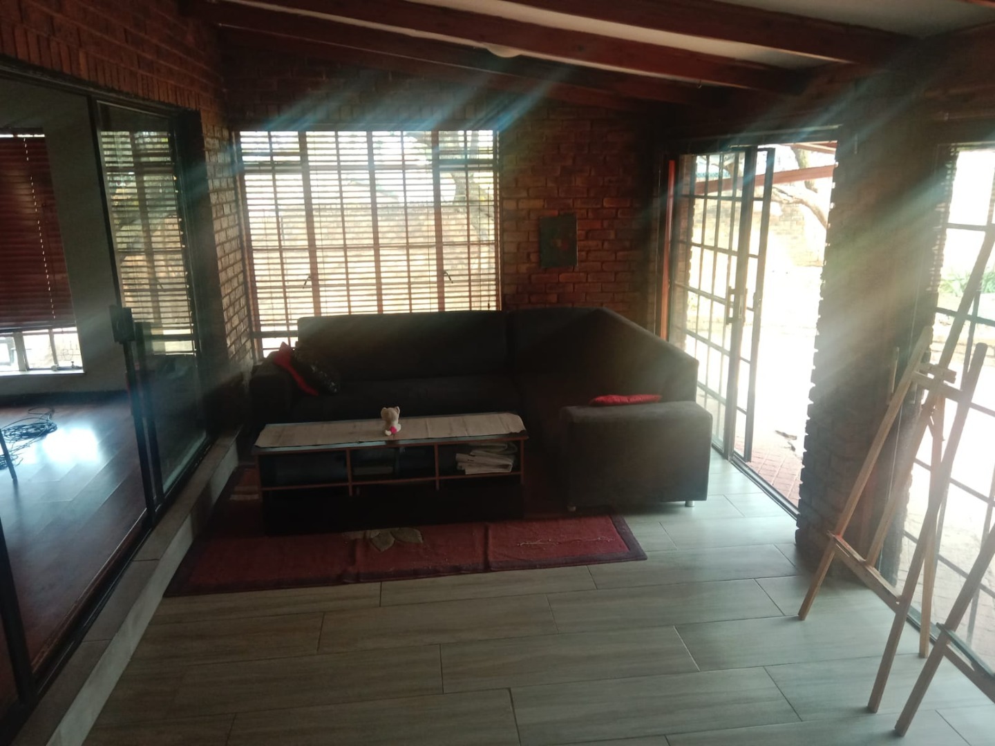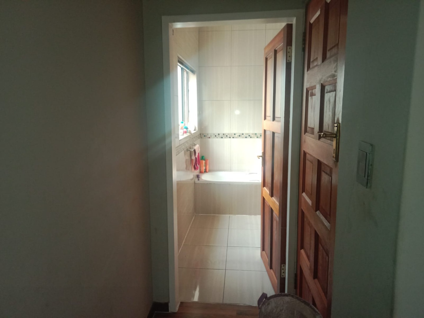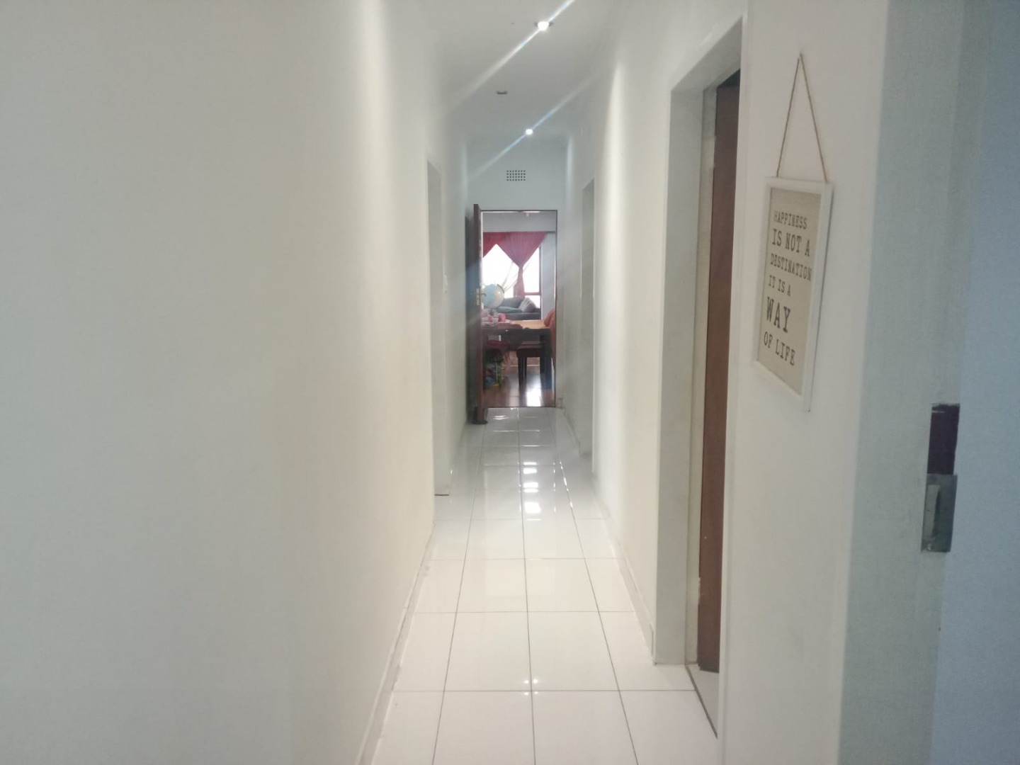 This inviting four bedroom, two bathroom residence, including one on-suite, is nestled in Mulbarton, Johannesburg. Designed for comfortable family living the home boasts an impressive open-plan layout connecting the living, dining and kitchen areas. The spacious lounge and dining room are bathed in natural light featuring modern wood-look laminate flooring and neutral walls complemented by an air conditioning unit and ceiling fan for comfort. An elegant arched entryway adds architectural interest.
