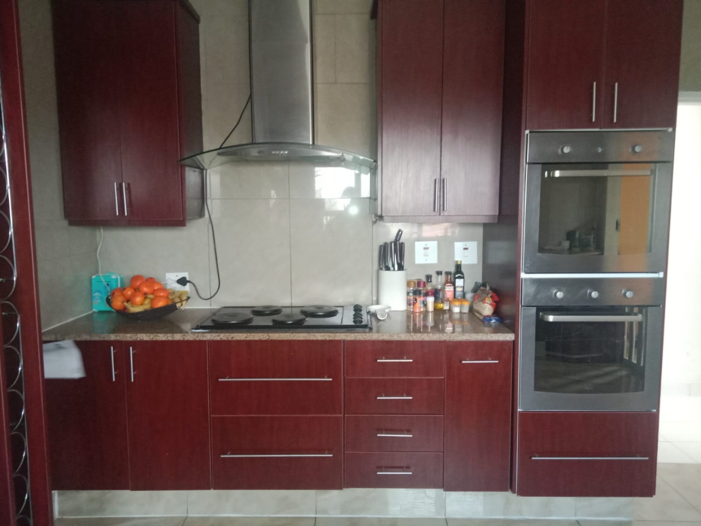 The modern kitchen is equipped with rich cherry wood-toned cabinetry, granite-effect countertops and tiled backsplash and floor. Integrated stainless steel appliances include a double oven, electric hob and a sleek extractor hood alongside a convenient built-in wine rack. A dedicated laundry room and study further enhance functionality.