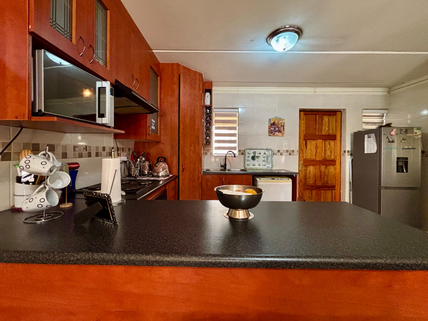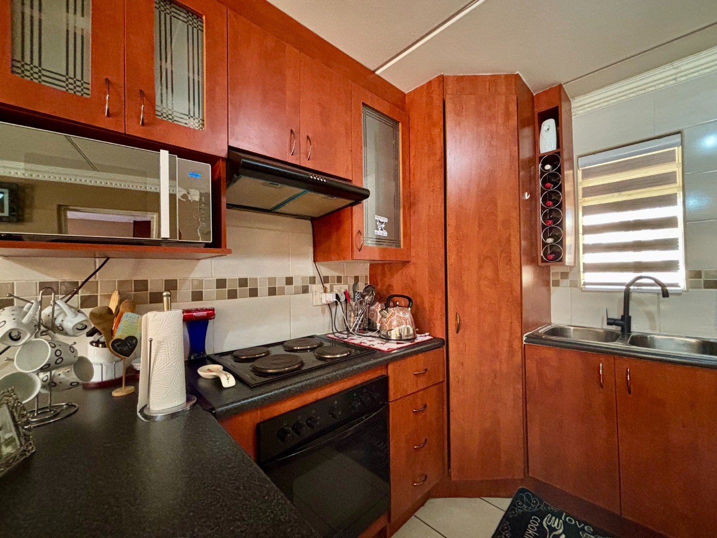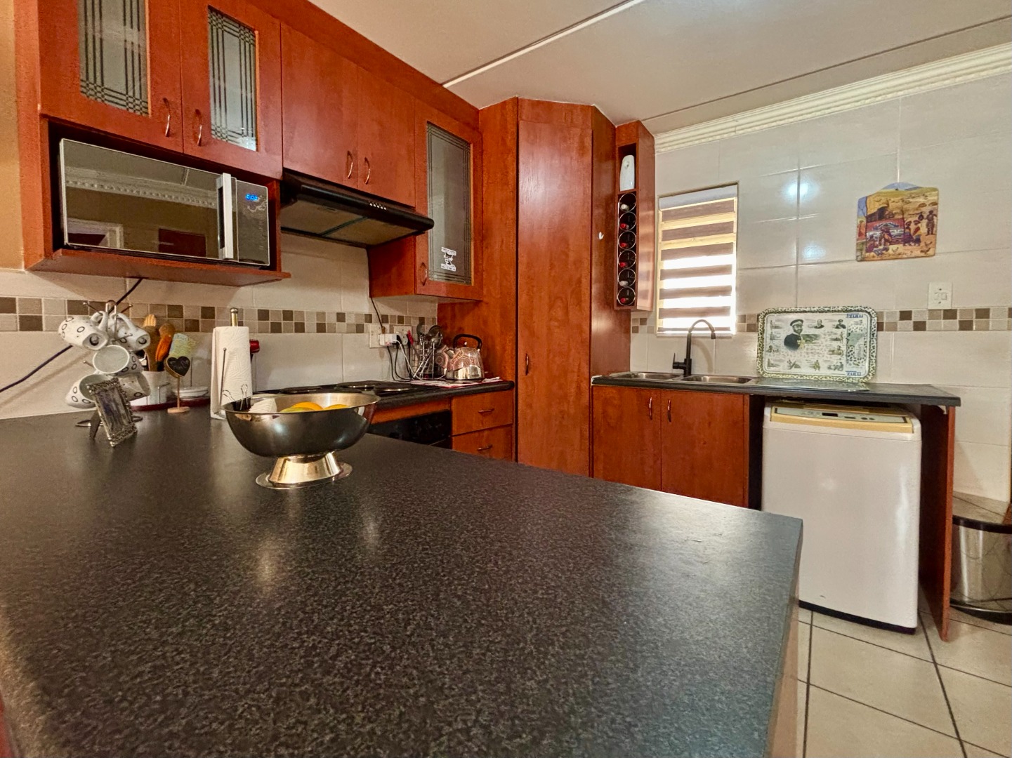 This charming ground-floor, one-bedroom unit offers the perfect blend of comfort and style. As you step in, you'll be greeted by a bright, open-plan space with a U-shaped kitchen adorned with elegant mahogany cabinetry. This kitchen is equipped with a four-plate stove, an under-counter oven, and an extractor, plus dedicated spaces for your modern appliances like a microwave, dishwasher, or washing machine. There's also a convenient space for a single-door fridge and an extended breakfast nook.