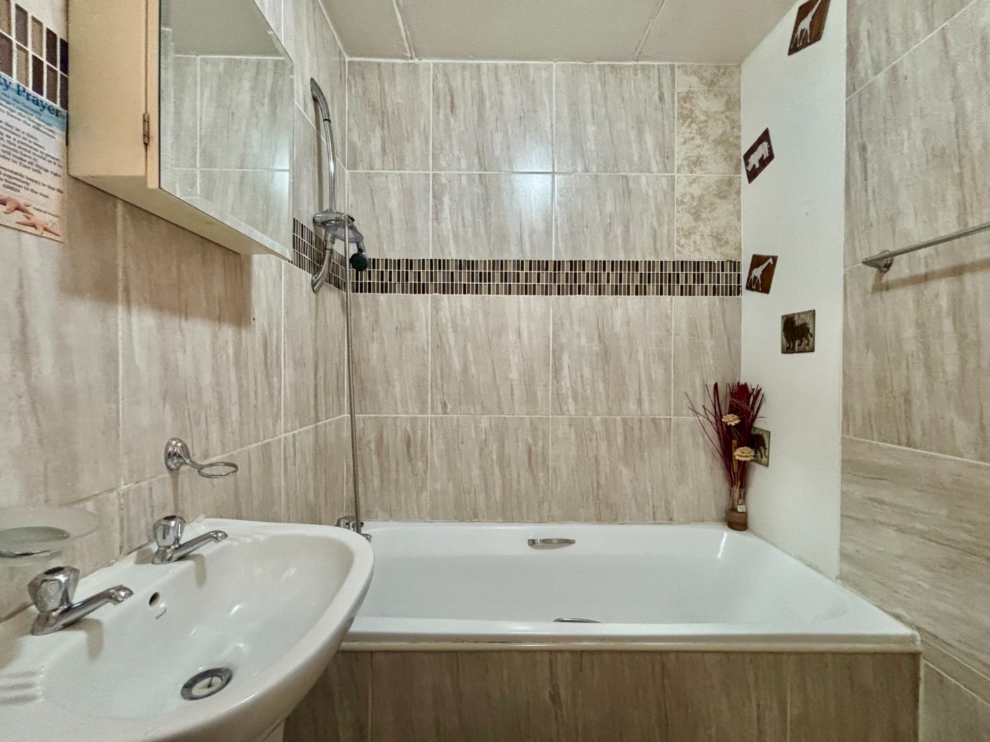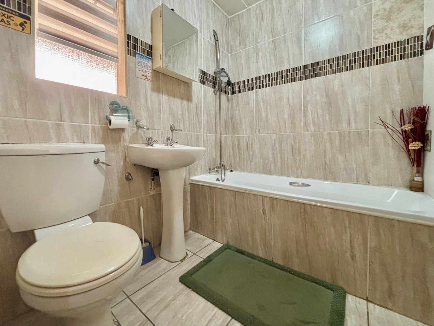 The bathroom is sleek and functional, featuring a bathtub with an integrated shower, a basin, and a toilet. The entire unit is tiled throughout, except for the bedroom, which boasts laminated flooring and built-in mahogany cupboards. The spacious lounge leads out to a small garden area, perfect for relaxing or entertaining.