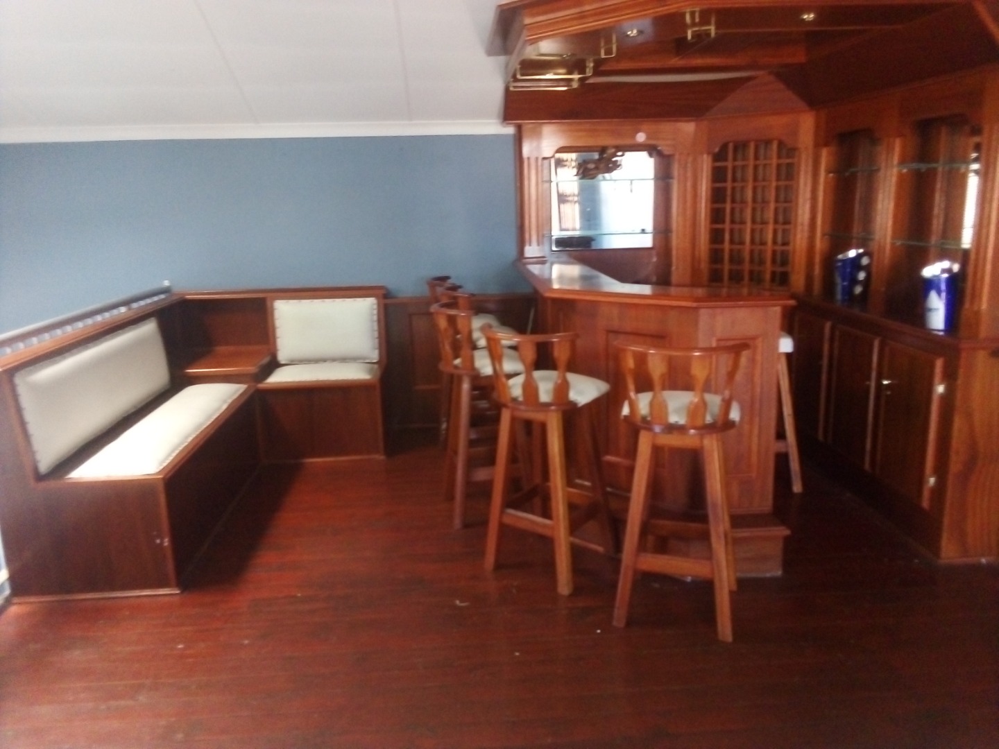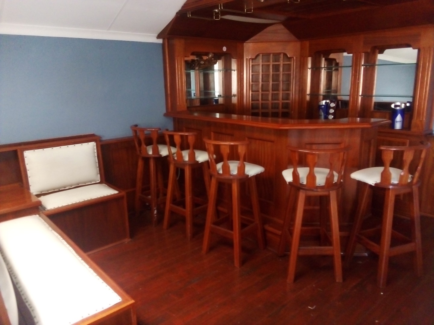 The heart of this home is its stylish open plan living area seamlessly integrating two lounges and a dedicated dining room. The modern kitchen boasts contemporary red cabinetry and a functional breakfast bar ideal for casual dining. Exposed wooden ceiling beams add character while a built-in bar enhances the entertainment potential of the main living space.