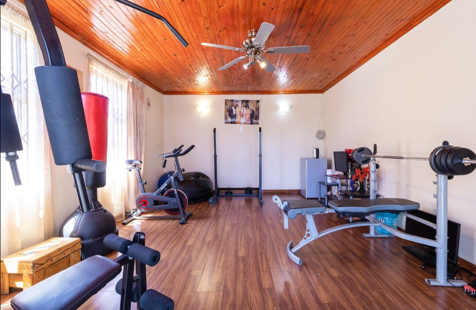 Outside you will enjoy the enclosed patio both morning and night which looks out onto the well maintained garden and swimming pool. It has a covered entertainment area with a snooker table and a fireplace, and there is an upstairs gym room to keep you and your family fit and healthy. The property has good security and has an electric fence.