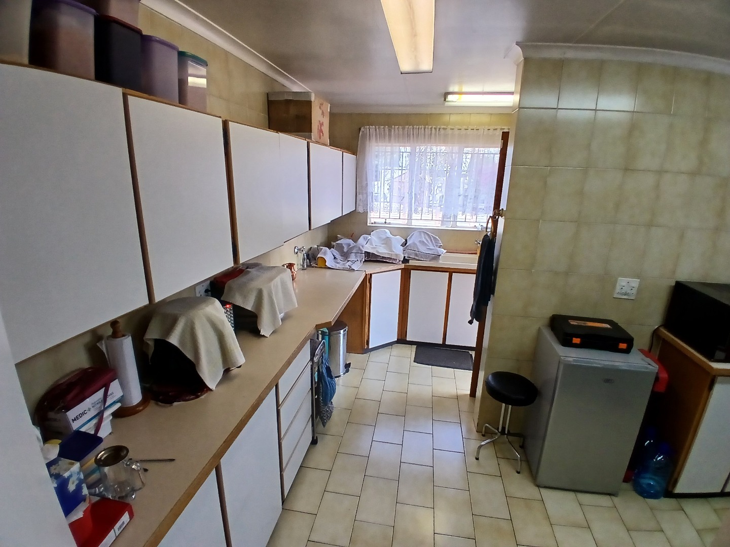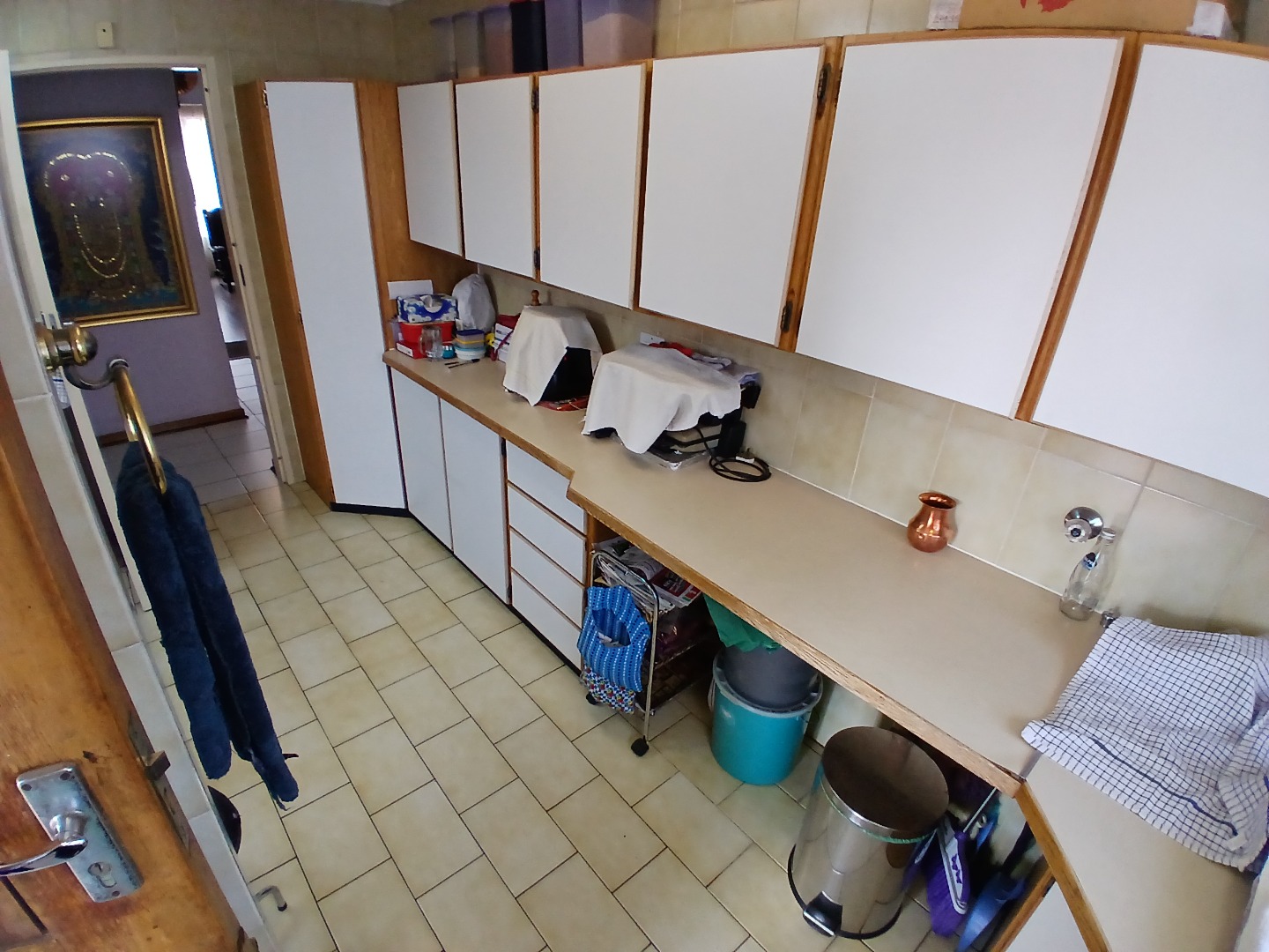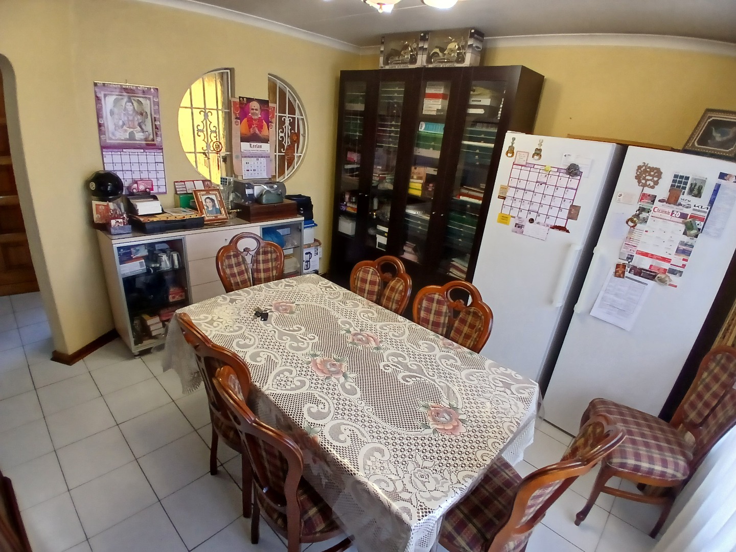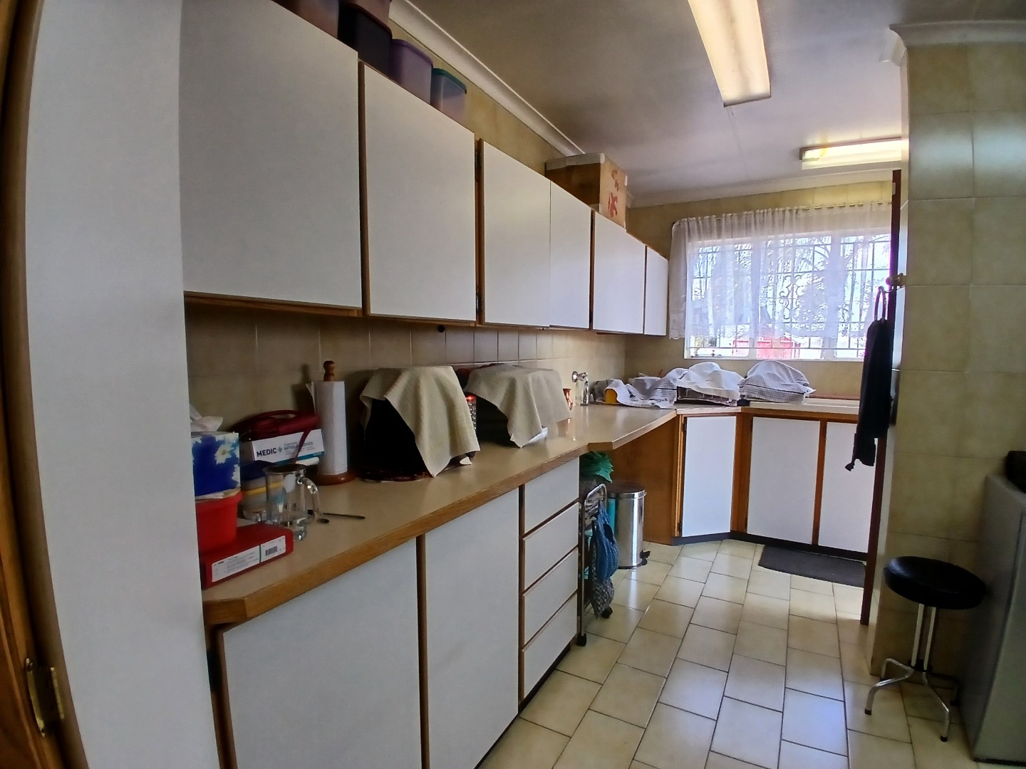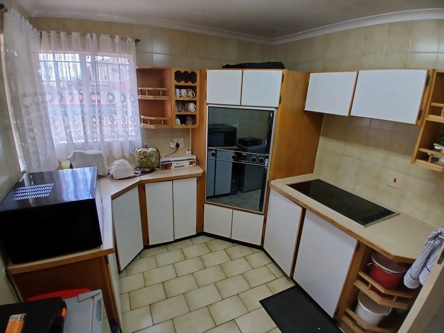 Inside the home offers a practical layout designed for comfortable living. It boasts two generous lounges and a dedicated dining room providing ample space for relaxation and entertaining. The functional kitchen while presenting an opportunity for modern updates features extensive cabinetry, abundant counter space, a built-in oven and a ceramic hob catering to all culinary needs. Durable tiled flooring extends throughout the living areas ensuring easy maintenance.
