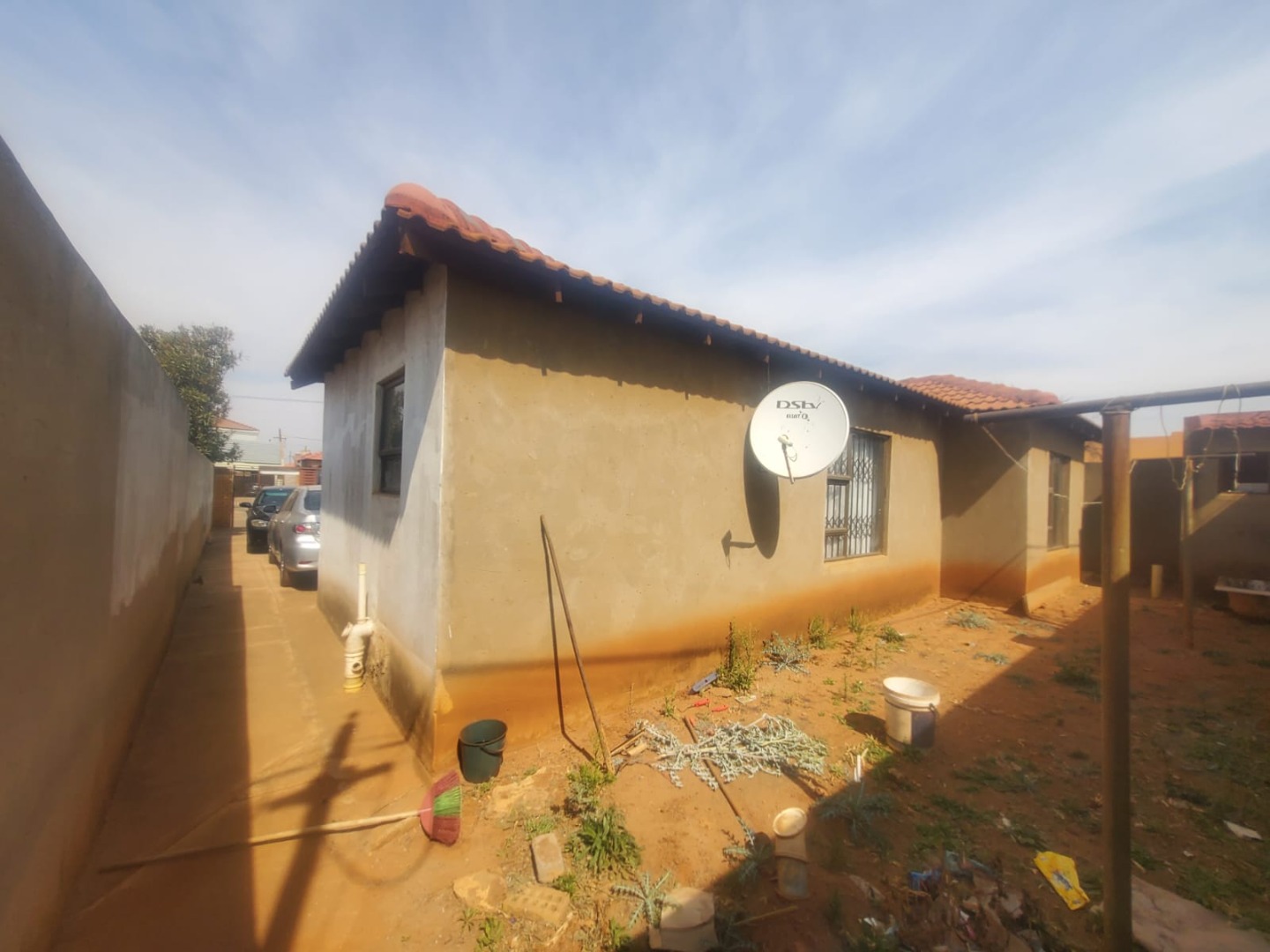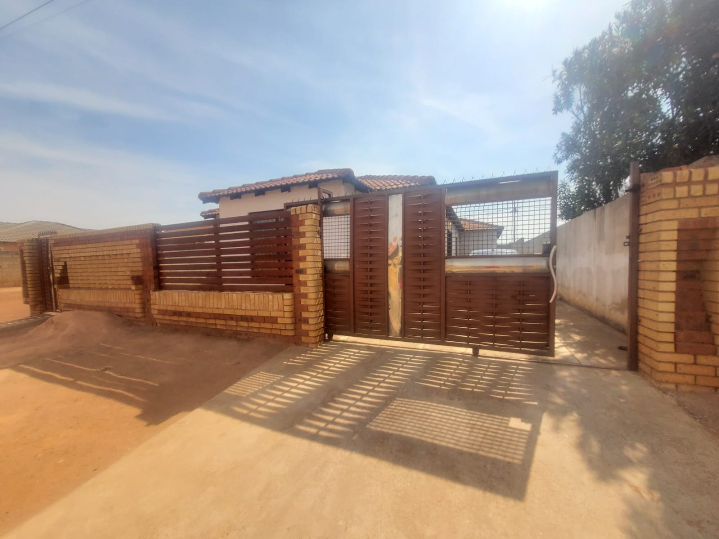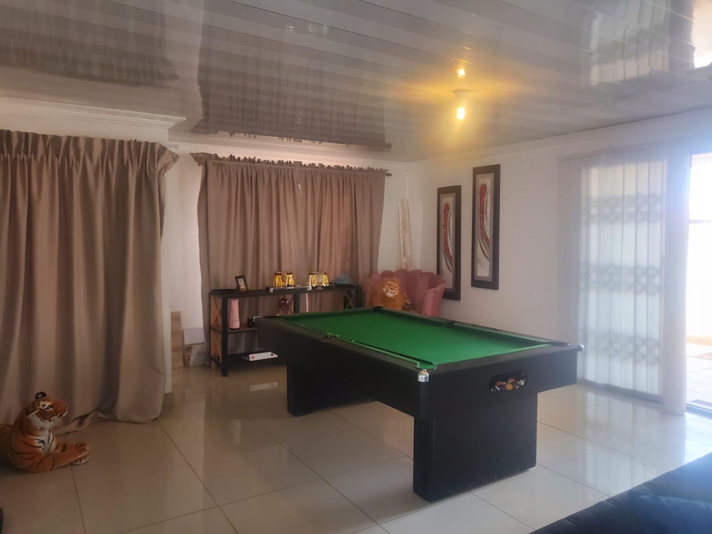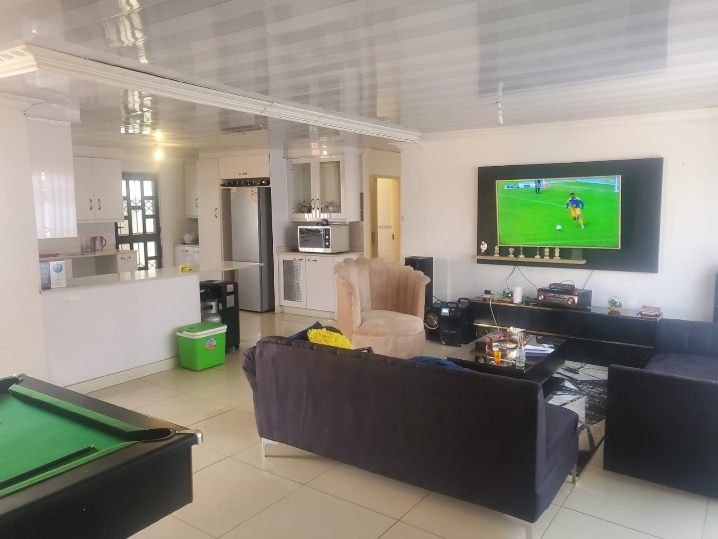 Discover this inviting suburban home located in Protea Glen, Soweto, offering a blend of comfort and practical living. The property presents a modern-style single-story residence with a durable tiled roof and a secure perimeter, featuring brick and metal fencing with both pedestrian and vehicular access gates. A welcoming covered patio provides an ideal space for outdoor relaxation and entertaining. Step inside to an open-plan living environment designed for contemporary lifestyles. The heart of the home is a modern white kitchen, boasting ample storage, a functional island that doubles as a breakfast bar, and sleek tiled flooring. This space seamlessly connects to a dedicated dining area and a comfortable lounge, which also serves as a family TV room. For leisure, a recreation area complete with a pool table offers an excellent entertainment hub. The interior is further enhanced by distinctive ceiling finishes and consistent tiled flooring throughout. This residence features three well-proportioned bedrooms, providing comfortable private spaces for the family. There are two bathrooms, including a convenient ensuite bathroom, ensuring privacy and ease for occupants. The property prioritizes security with visible security bars on windows and security gates on doors, complementing the robust perimeter fencing. With three dedicated parking spaces, this home caters to practical needs. Its suburban location in Protea Glen offers a desirable setting for family living, combining accessibility with a sense of community. Key Features: * 3 Bedrooms, 2 Bathrooms (1 Ensuite) * Open-plan Living and Dining Areas * Modern Kitchen with Island * Dedicated Entertainment Space with Pool Table * Covered Patio * Secure Perimeter Fencing with Gates * Security Bars and Gates for Enhanced Safety * 3 Parking Spaces * Tiled Flooring Throughout