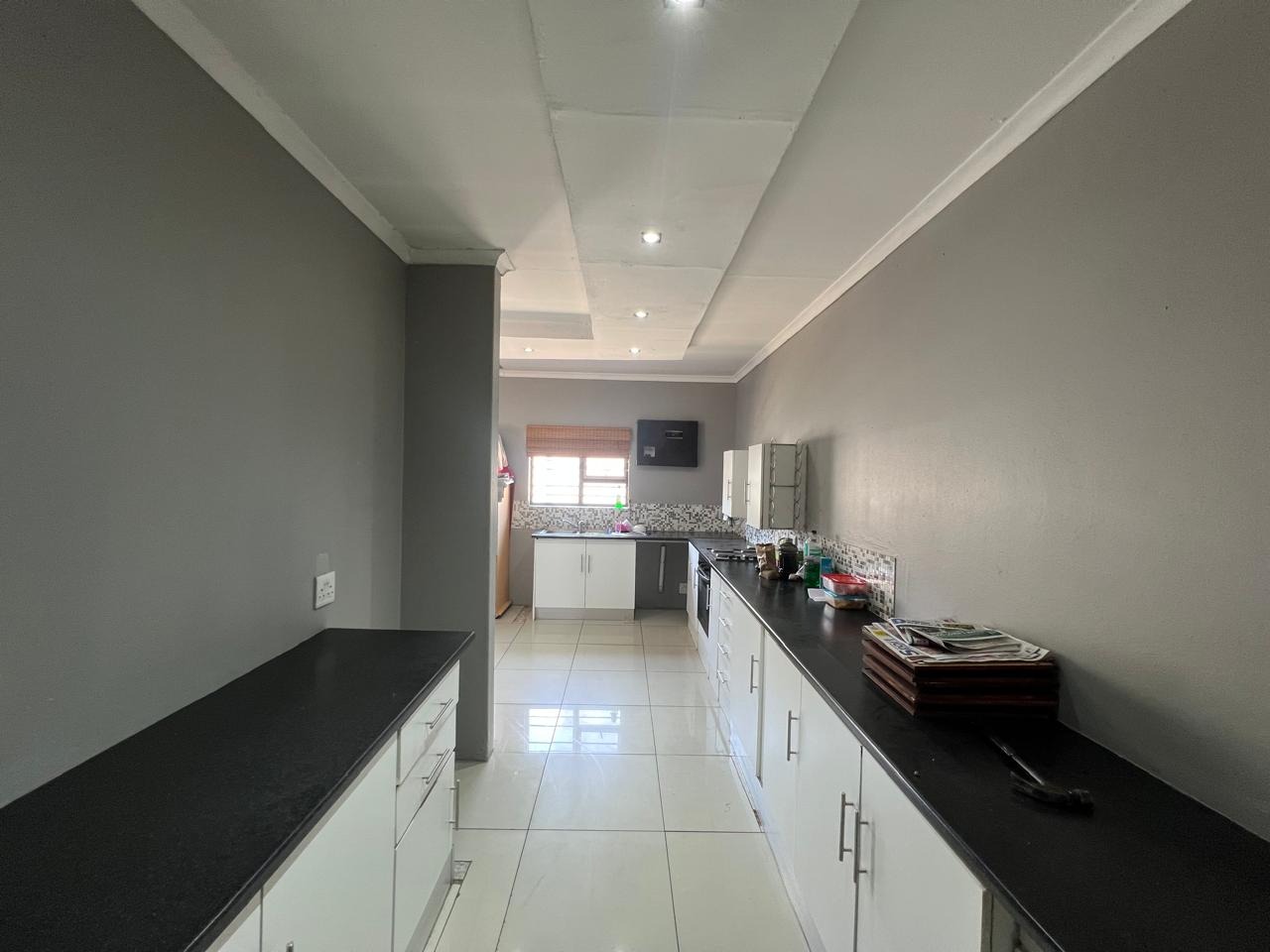 Discover the epitome of refined suburban living in this exquisite 3-bedroom residence, perfectly situated in the tranquil Alberton. Step into a world where modern design meets functional elegance, beginning with a seamless open-plan living and dining area. The space is adorned with sophisticated neutral grey walls and pristine tiled flooring, creating an inviting ambiance for both relaxation and entertaining. The gourmet kitchen, a true culinary haven, boasts a contemporary two-tone aesthetic with sleek white cabinetry, dark countertops, and a captivating mosaic tile backsplash. Equipped with a built-in oven and hob, and illuminated by recessed lighting, it offers ample space for culinary exploration.