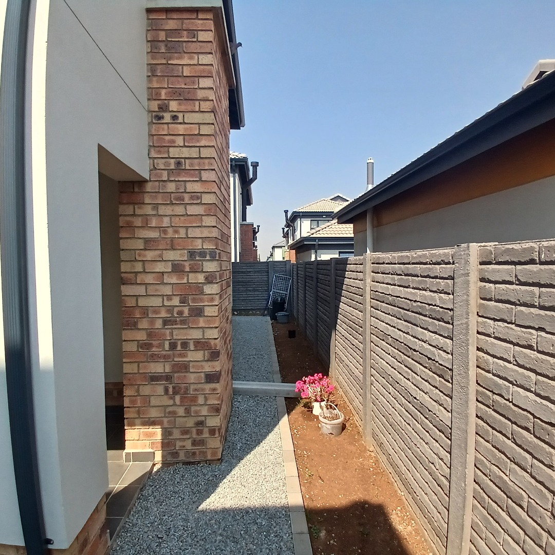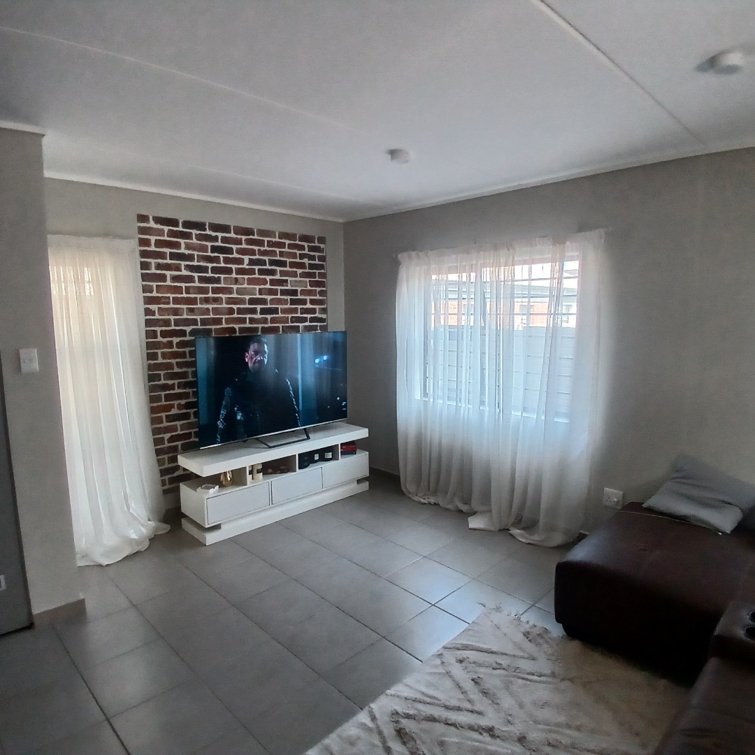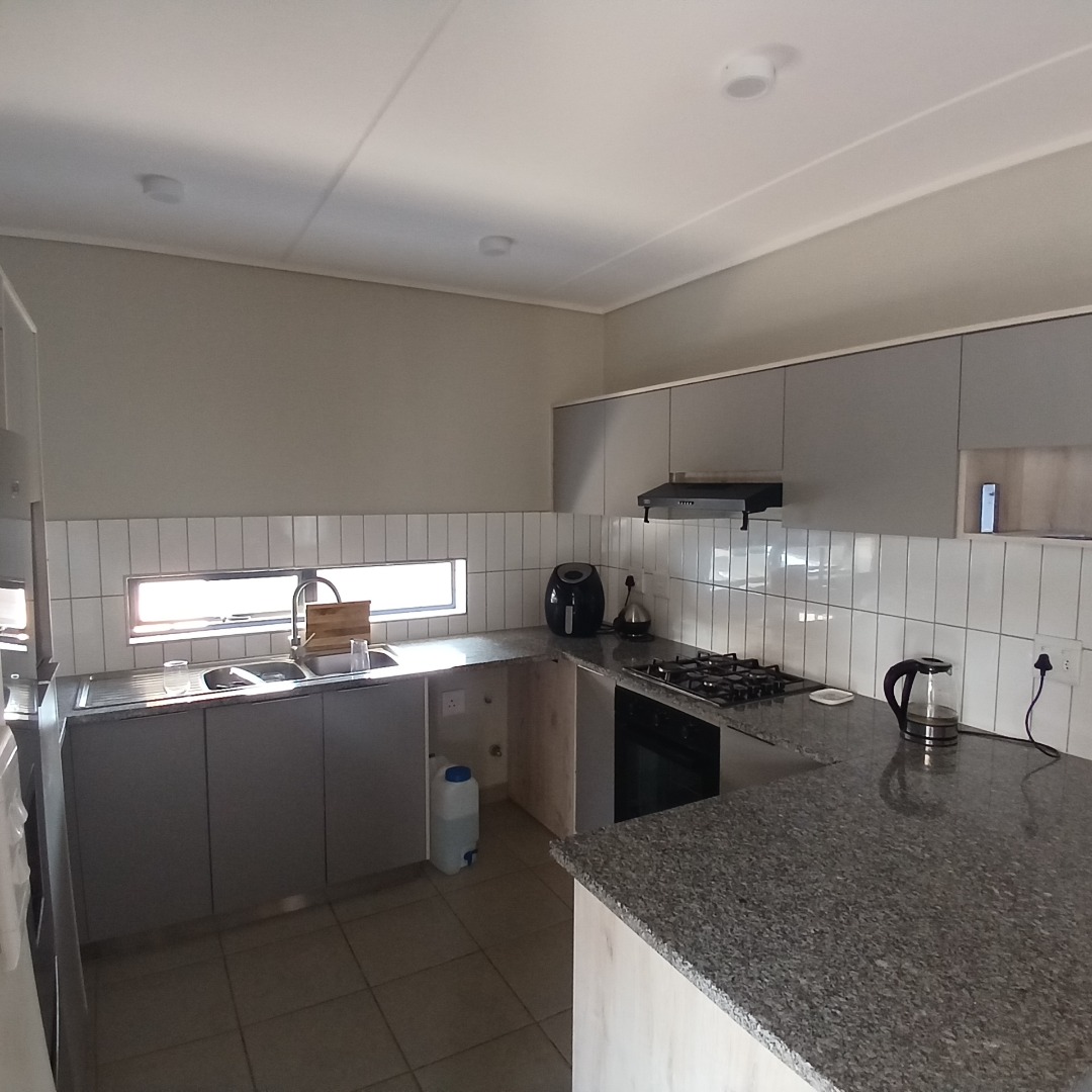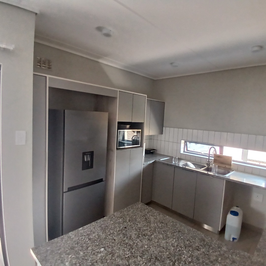 Discover modern living in this inviting 4-bedroom, 3-bathroom home available for rent within a secure estate in Albertsdal, Alberton. Designed for comfort and convenience, this residence features an open-plan layout seamlessly connecting the lounge and dining areas, both adorned with durable tiled flooring. The contemporary kitchen is a highlight, boasting sleek grey cabinetry, speckled granite countertops, a white subway tile backsplash, a built-in gas hob, oven, and extractor fan, along with dedicated spaces for a large refrigerator and microwave. An additional study provides a versatile space for work or hobbies, while a guest toilet adds to the home's practicality. The living area is further enhanced by a stylish faux brick accent wall and large windows that invite ample natural light.
