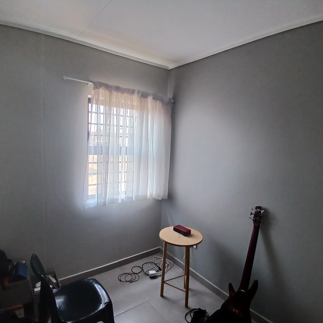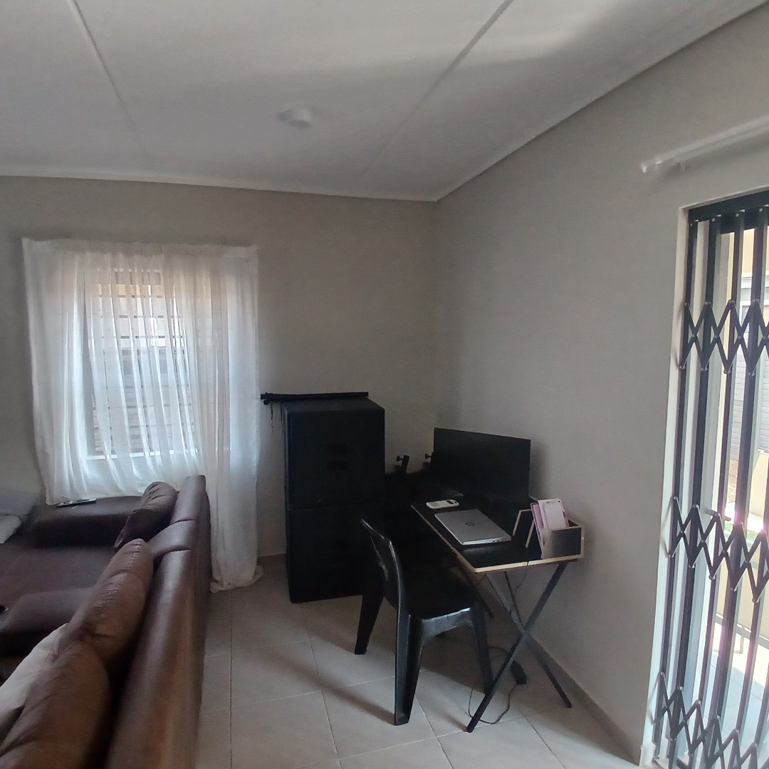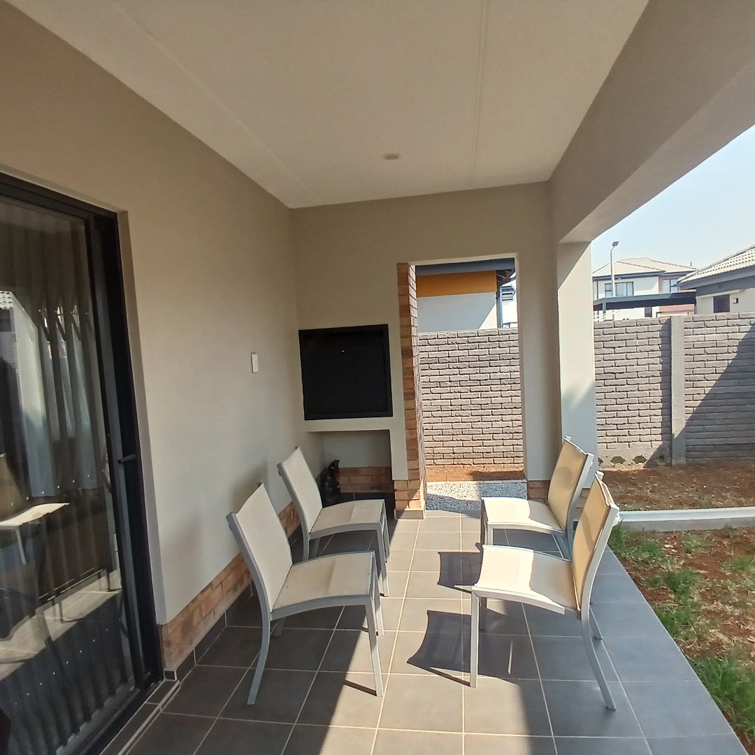 Discover modern living in this inviting 4-bedroom, 3-bathroom home available for rent within a secure estate in Albertsdal, Alberton. Designed for comfort and convenience, this residence features an open-plan layout seamlessly connecting the lounge and dining areas, both adorned with durable tiled flooring. The contemporary kitchen is a highlight, boasting sleek grey cabinetry, speckled granite countertops, a white subway tile backsplash, a built-in gas hob, oven, and extractor fan, along with dedicated spaces for a large refrigerator and microwave. An additional study provides a versatile space for work or hobbies, while a guest toilet adds to the home's practicality. The living area is further enhanced by a stylish faux brick accent wall and large windows that invite ample natural light.