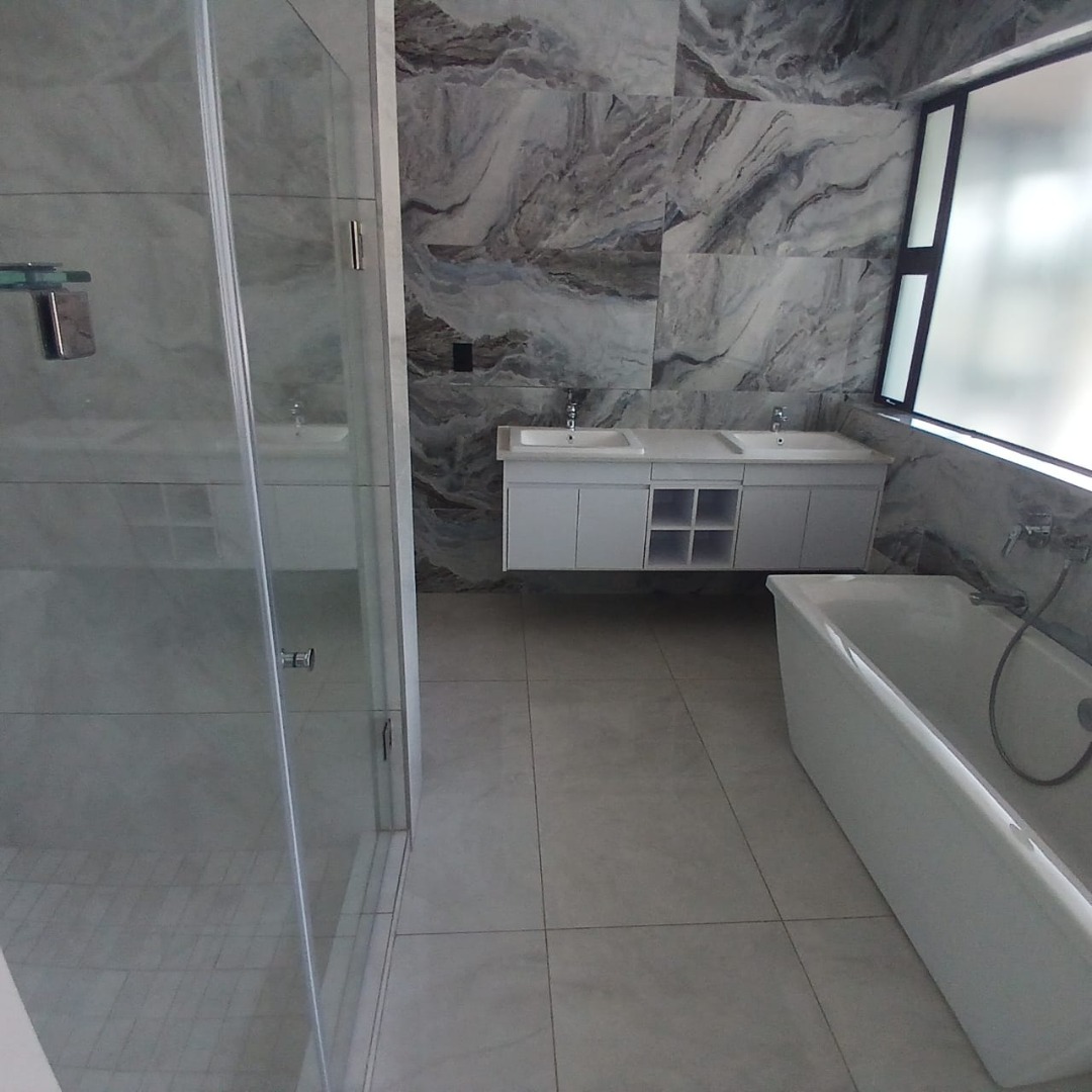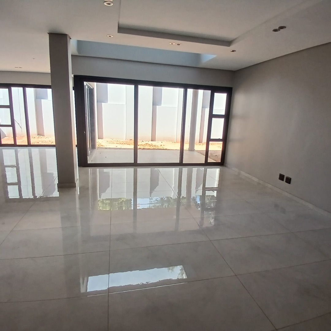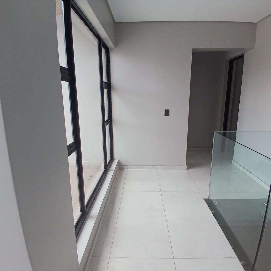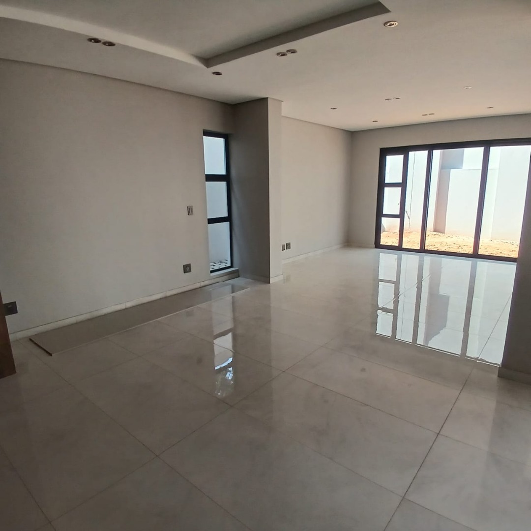 The meticulously crafted interior boasts an open-plan design, seamlessly connecting the lounge and dedicated dining room and a comfortable family/TV room upstairs. The heart of the home features a state-of-the-art kitchen, showcasing sleek, glossy light-toned cabinetry, dark contrasting countertops, a generous island with an integrated sink and a built-in oven. A separate scullery and pantry enhance functionality, catering to every culinary need. Ascend to the upper levels via a striking floating staircase with elegant glass balustrades, a true architectural statement. This magnificent property comprises four lavish bedrooms, each accompanied by its own onsuite bathroom, ensuring ultimate privacy and comfort. Abundant natural light floods the interiors through large glass doors and windows, illuminating the pristine glossy tiled flooring and neutral walls. Outdoor living is effortlessly accommodated with a private balcony and patio, complemented by a well-maintained garden and paving.