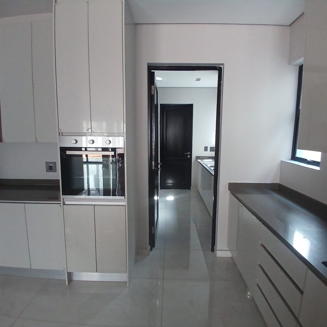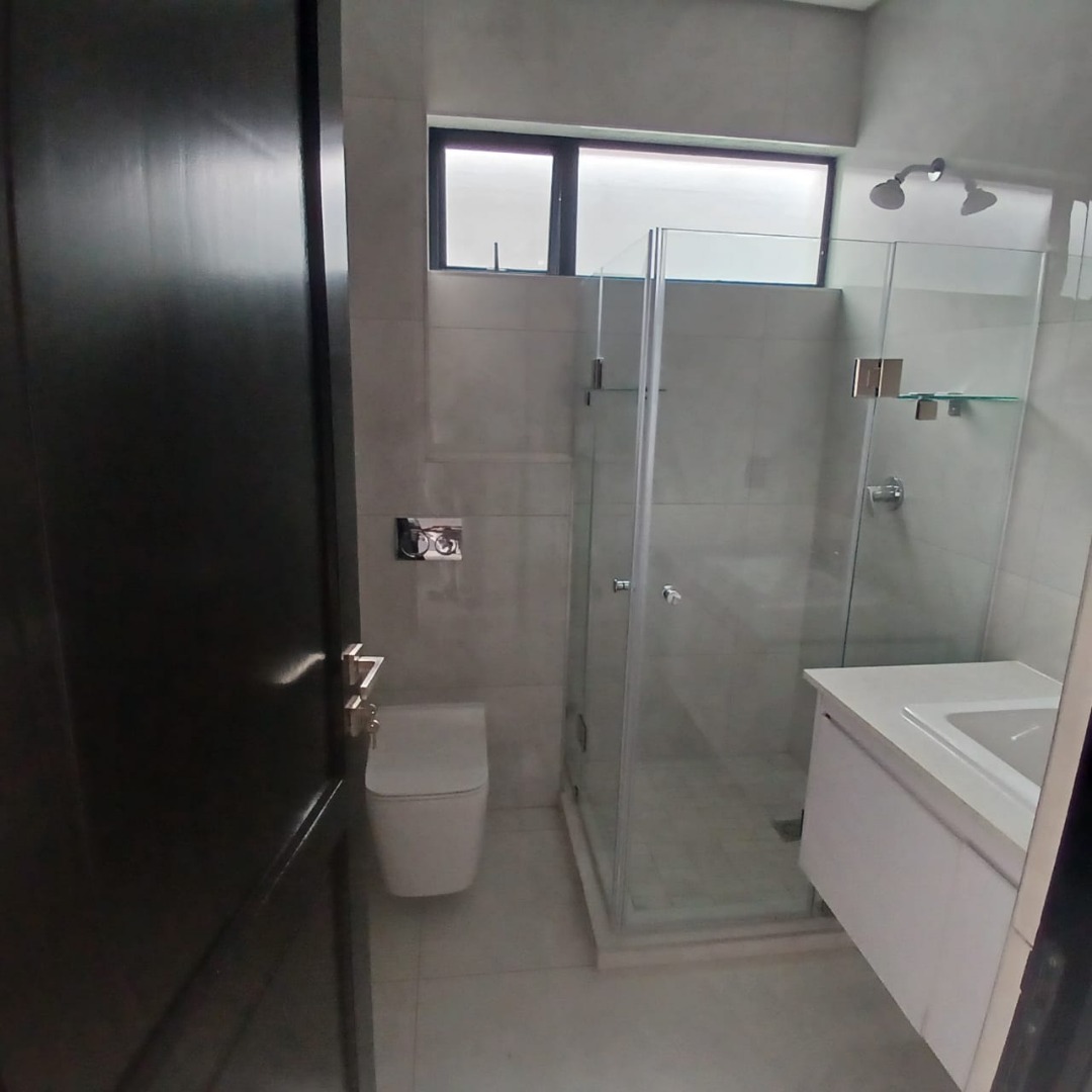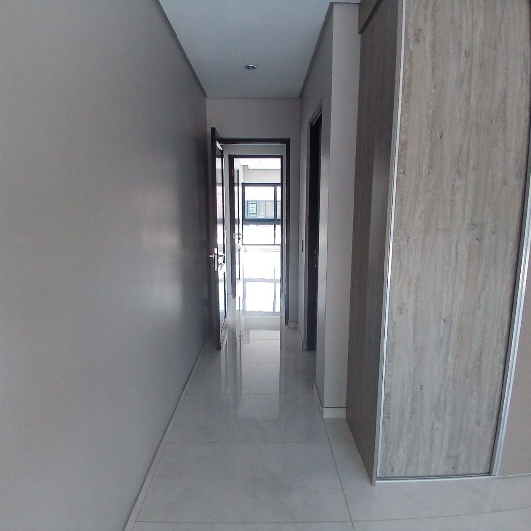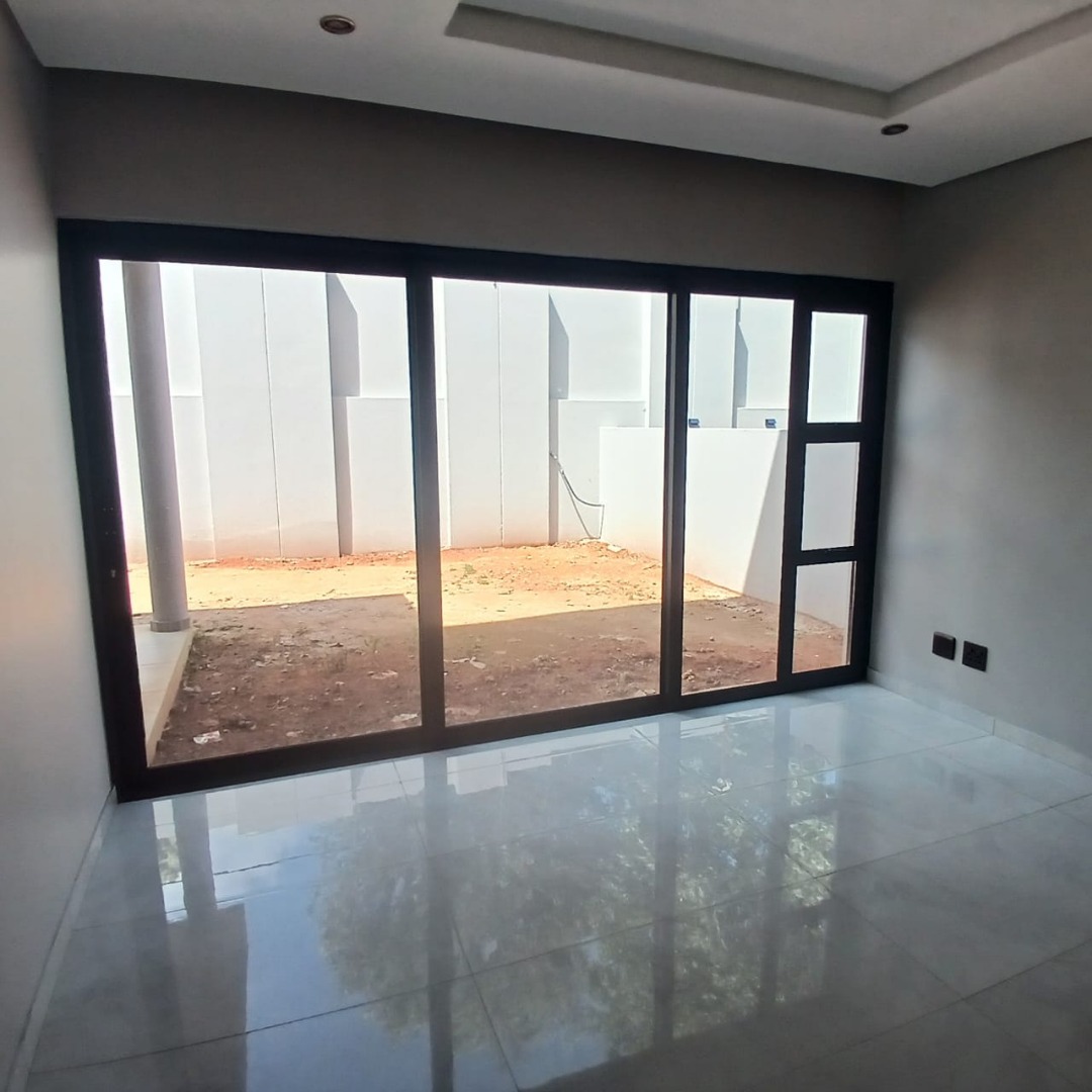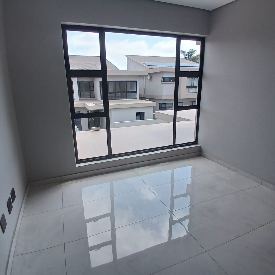 The meticulously crafted interior boasts an open-plan design, seamlessly connecting the lounge and dedicated dining room and a comfortable family/TV room upstairs. The heart of the home features a state-of-the-art kitchen, showcasing sleek, glossy light-toned cabinetry, dark contrasting countertops, a generous island with an integrated sink and a built-in oven. A separate scullery and pantry enhance functionality, catering to every culinary need. Ascend to the upper levels via a striking floating staircase with elegant glass balustrades, a true architectural statement. This magnificent property comprises four lavish bedrooms, each accompanied by its own onsuite bathroom, ensuring ultimate privacy and comfort. Abundant natural light floods the interiors through large glass doors and windows, illuminating the pristine glossy tiled flooring and neutral walls. Outdoor living is effortlessly accommodated with a private balcony and patio, complemented by a well-maintained garden and paving.