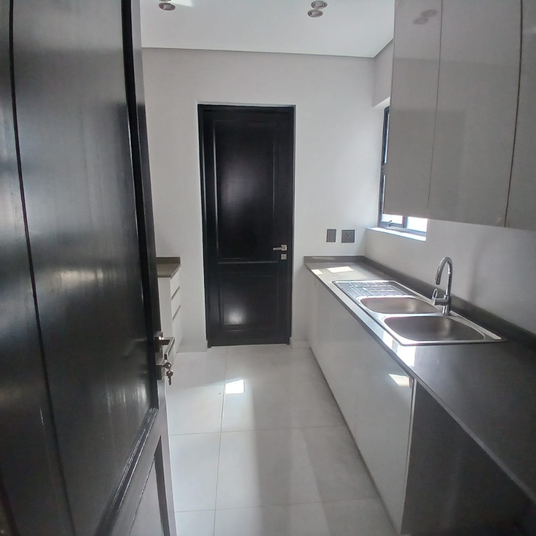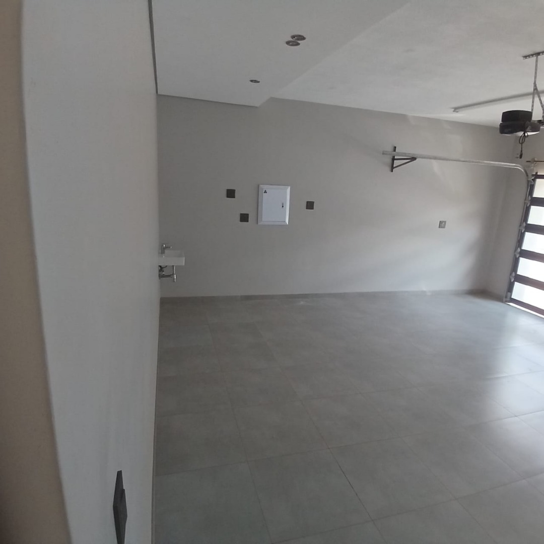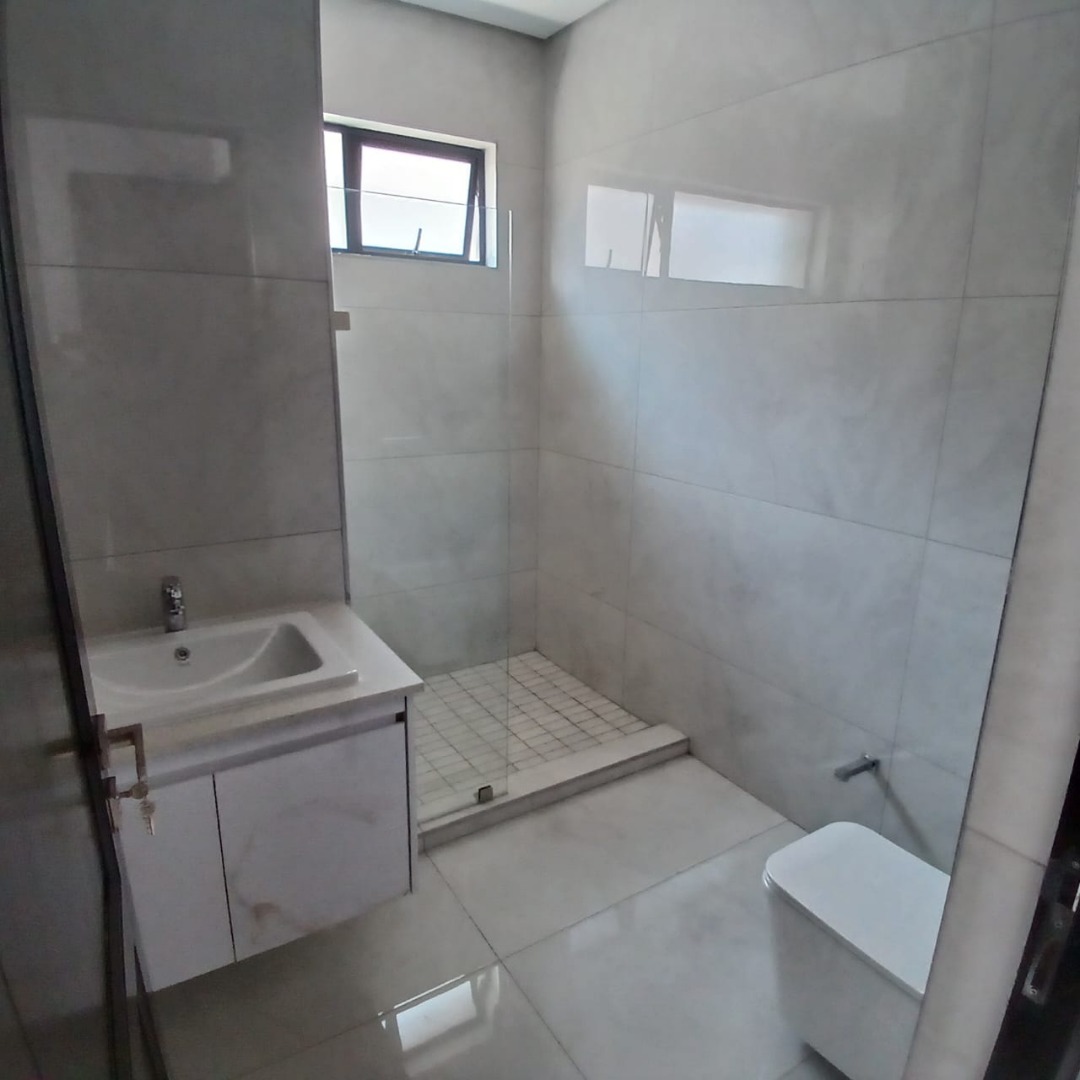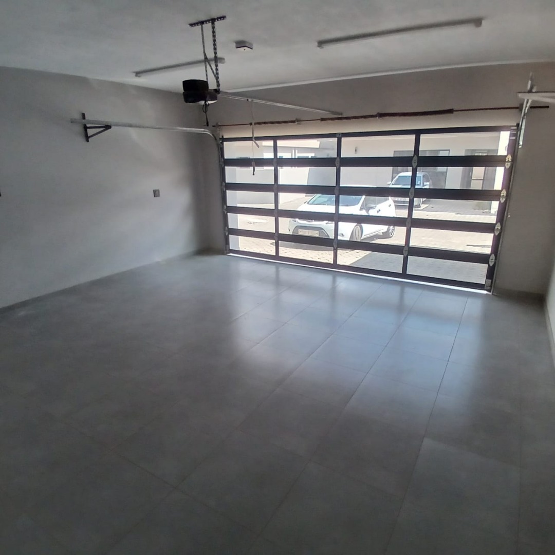 The meticulously crafted interior boasts an open-plan design, seamlessly connecting the lounge and dedicated dining room and a comfortable family/TV room upstairs. The heart of the home features a state-of-the-art kitchen, showcasing sleek, glossy light-toned cabinetry, dark contrasting countertops, a generous island with an integrated sink and a built-in oven. A separate scullery and pantry enhance functionality, catering to every culinary need. Ascend to the upper levels via a striking floating staircase with elegant glass balustrades, a true architectural statement. This magnificent property comprises four lavish bedrooms, each accompanied by its own onsuite bathroom, ensuring ultimate privacy and comfort. Abundant natural light floods the interiors through large glass doors and windows, illuminating the pristine glossy tiled flooring and neutral walls. Outdoor living is effortlessly accommodated with a private balcony and patio, complemented by a well-maintained garden and paving.