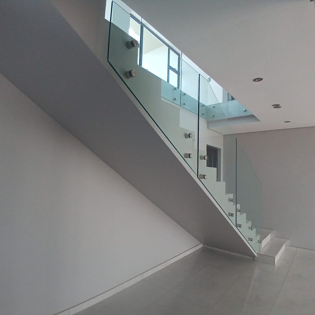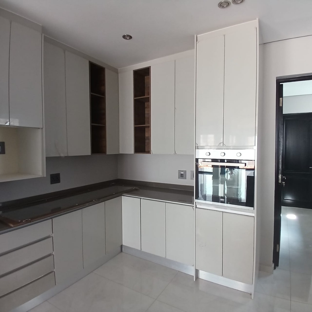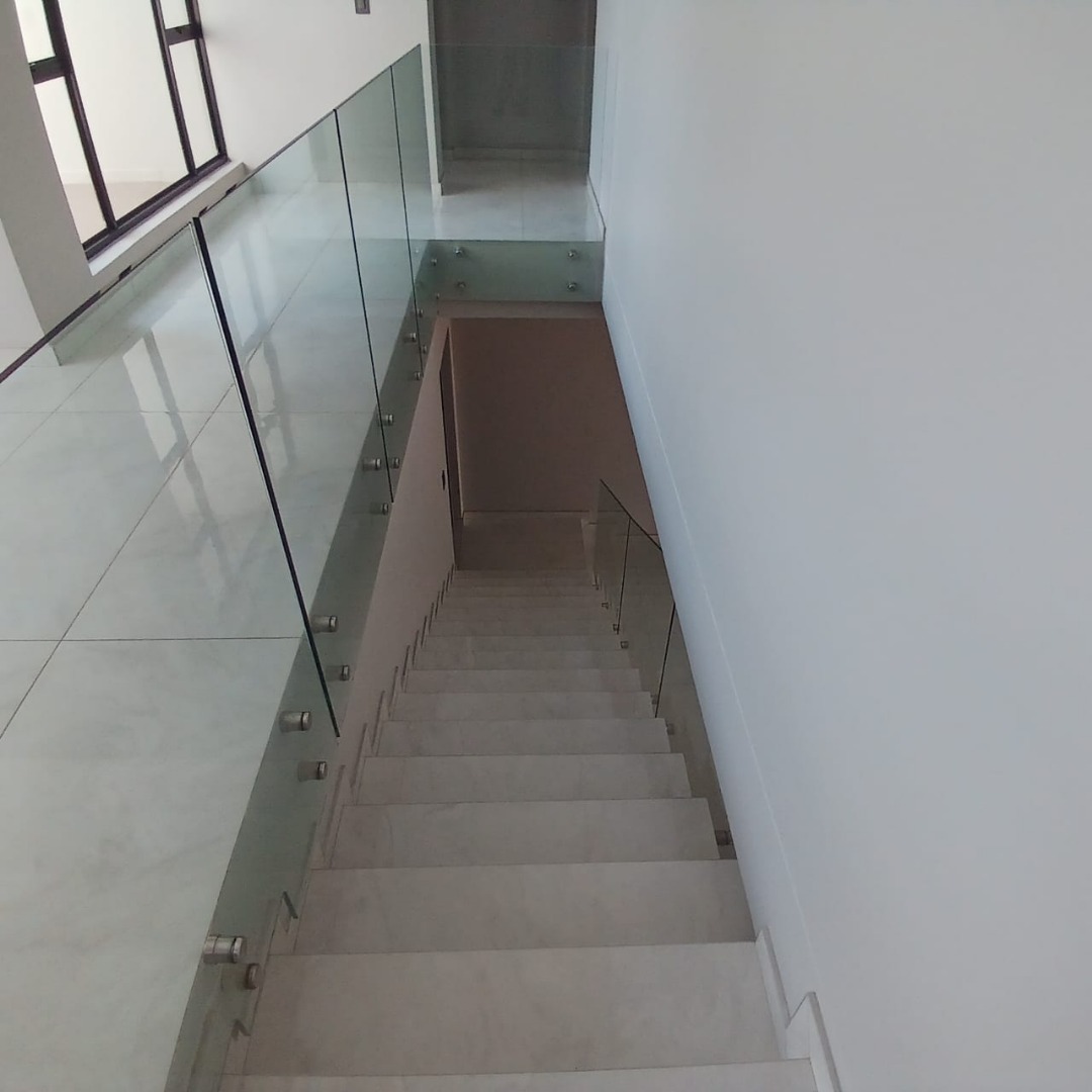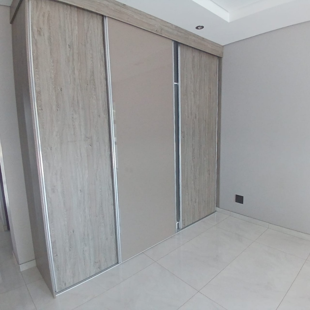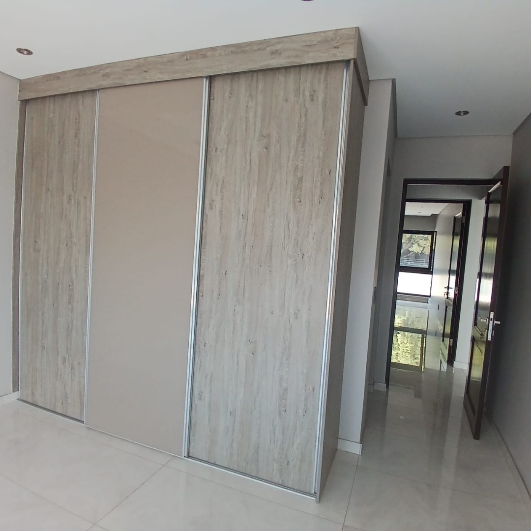 The meticulously crafted interior boasts an open-plan design, seamlessly connecting the lounge and dedicated dining room and a comfortable family/TV room upstairs. The heart of the home features a state-of-the-art kitchen, showcasing sleek, glossy light-toned cabinetry, dark contrasting countertops, a generous island with an integrated sink and a built-in oven. A separate scullery and pantry enhance functionality, catering to every culinary need. Ascend to the upper levels via a striking floating staircase with elegant glass balustrades, a true architectural statement. This magnificent property comprises four lavish bedrooms, each accompanied by its own onsuite bathroom, ensuring ultimate privacy and comfort. Abundant natural light floods the interiors through large glass doors and windows, illuminating the pristine glossy tiled flooring and neutral walls. Outdoor living is effortlessly accommodated with a private balcony and patio, complemented by a well-maintained garden and paving.